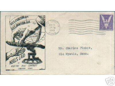 16k | Commemorative postal cover marking the twin laying of the keels of the Cabezon (SS-334) & Dentuda (SS-335), 18 November 1943, at the Electric Boat Company, Groton, CT. | Courtesy of Jack Treutle (of blessed memory). | |
