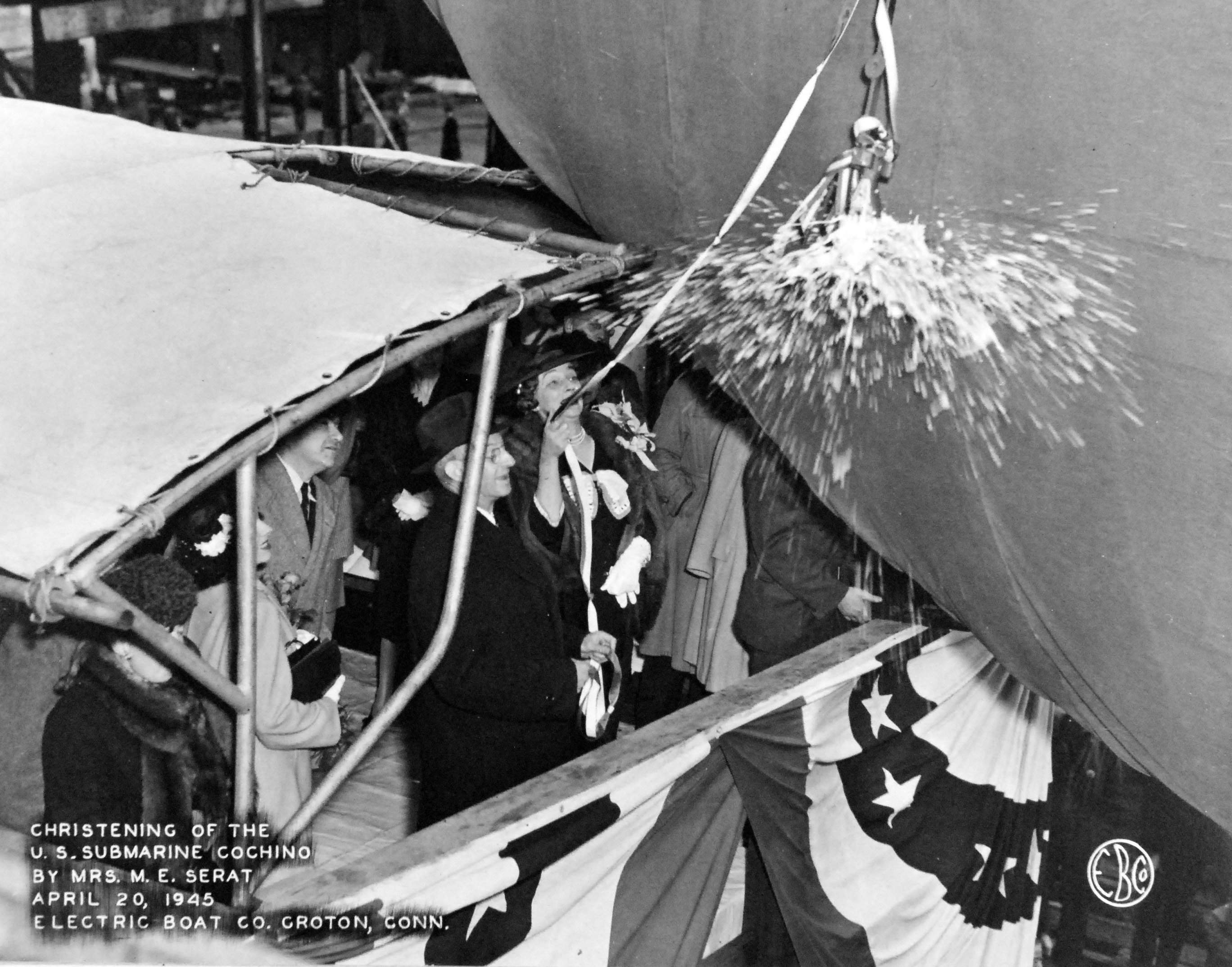 524k | Cochino (SS-345) at Electric Boat Company, Groton, Connecticut, 20 April 1945. Shown: Mrs. M.E. Serat, christening the ship. | USN photo # 80-G-409422 courtesy of National Museum of the U.S. Navy. | |