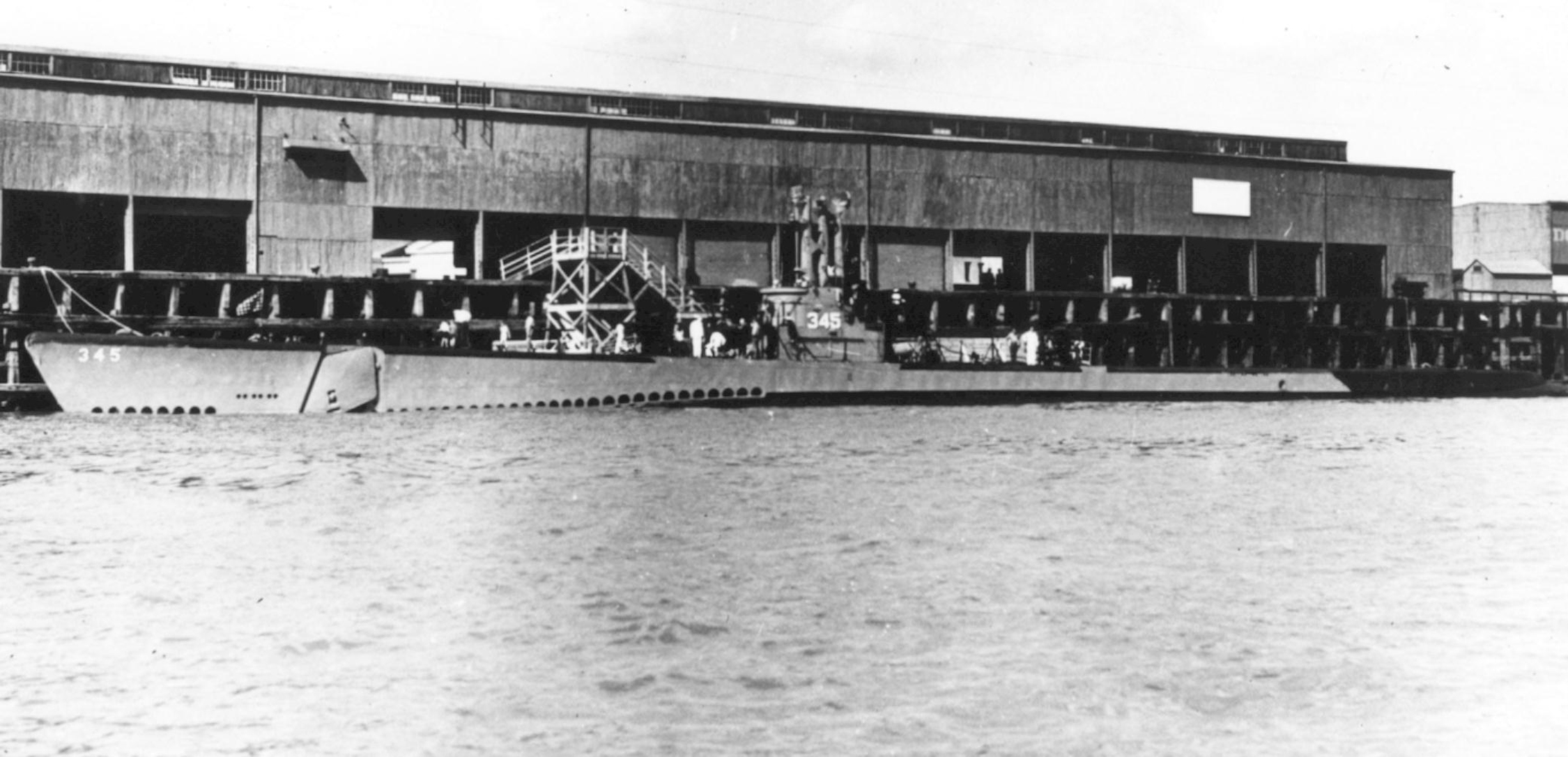 552k | Looks like the start of another work day as E.B. employees climb up the stairwell past the "No Swimming at this site" sign near the new North Yard. An officer on deck of the soon to be launched Blenny (SS-324) looks across the opposite ways at the construction of a prefabricated section of the Cochino (SS-345). The pace of construction progresses quickly as a worker tightens the bolts on part of her hull. The Cochino's keel would officially be laid 13 April. Construction of the boat will be moved over to the soon to be vacated way that the Blenny now occupies. By early 1944, most of the building yards were forced to adopt some measure of pre-fabrication in order to expedite the building process. Manitowoc was the acknowledged master of this art and it allowed them to complete boats quickly in a limited amount of building space (Manitowoc built their boats to EB plans). While EB did not go to the same extent as Manitowoc, even they pre-fabricated some sections and attached them to the keel once it was laid. The date of the photo is probably around the first week of April 1944. The Blenny would be launched on the 9th. Note the Blenny's open outer torpedo door shutters still need to be affixed. | NARA FILE #: 80-G-468517, photographed by Lt. Comdr. Charles Fenno Jacobs, USNR. Photo # HD-SN-99-02479, courtesy of dodmedia.osd.mil, Defense Visual Information Center. Photo i.d. courtesy of John Hummel, Ric Hedman & David Johnston. Partial text courtesy of David Johnston | |