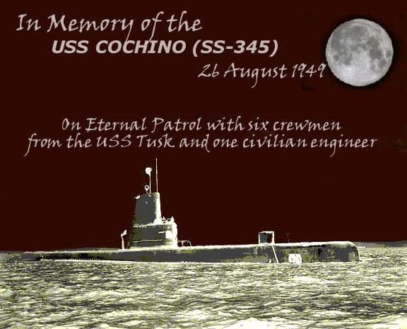 NR | COCHINO (SS-345) SURVIVOR IN REUNION Commander Rafael C. Benitez, Groton, Conn., gathers his wife and children into his arms in a joyful reunion at the submarine base in Groton following arrival of submarine Tusk (SS-426) which brought survivors of submarine Cochino home. He was in command of the Cochino when she exploded and sank in Arctic waters recently. The youngsters are Peggy, 1 & 1/2, and Crissie, 3. Six of the crew of the rescue ship Tusk were swept overboard and drowned. Comdr. Robert K. Worthington, jr„ of Philadelphia, skipper of the Tusk, which rescued the crew of the Cochino, was welcomed by his children, Robin, 4 (right), and Robert, 1. | Image and text provided by Library of Congress, Washington, DC. Photo from Evening Star. [volume] (Washington, D.C.) 1854-1972, 09 September 1949, Image 3, via chroniclingamerica.loc.gov. |