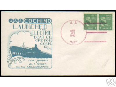 18k | Commemorative postal cover on the occasion of the launching of the Cochino (SS-345), 20 April 1945. | Courtesy of Jack Treutle (of blessed memory). | |