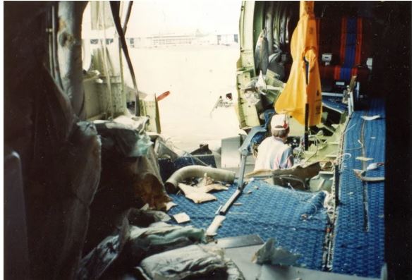 487k | Cargo Door Assembled Interior from United Airlines Flight 811 from Los Angeles to Sydney, with intermediate stops at Honolulu and Auckland. On 24 February 1989, the Boeing 747-122 serving the flight experienced a cargo-door failure in flight at 22,000 feet shortly after leaving Honolulu. The resulting explosive decompression blew out several rows of seats, killing nine passengers. The aircraft returned to Honolulu and landed with no further incident. The Sea Cliff (DSV-4) recovered the door at a depth of 14,000 feet. |