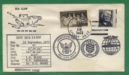 42k | Postal cover marking the dive of the Sea Cliff (DSV-4), 14 September 1973. | Courtesy of Jack Treutle (of blessed memory). | |