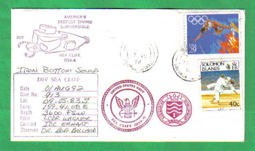 48k | Postal cover marking the dive of the Sea Cliff (DSV-4), at Iron Bottom Sound off Guadalcanal, with Prof. Robert Ballard, while filming a National Geographic Special, 1 August 1992. | Courtesy of Jack Treutle (of blessed memory). | |