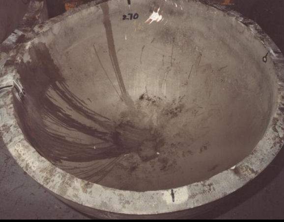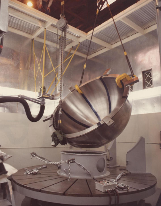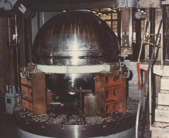 29k | One of the two hemispheres of the Sea Cliff (DSV-4) as received from RMI. Titanium plate about 4 inches thick was forged into the hemispheres. Note; as received, there were many cracks on the surface of the hemispheres, some about an inch deep. The cracks from the forging process were deeper than we thought they would be and there was some concern that the cracks would not be completely removed during machining. The hemispheres were machined both inside and outside to the correct shape, but were left oversize to allow for any distortion during welding. |