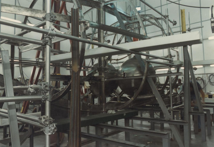 72k | Another view of the titanium frame during fabrication. The two titanium spheres in the photo are the high pressure air flask. | Photo & text courtesy of Jim Richardson. | |