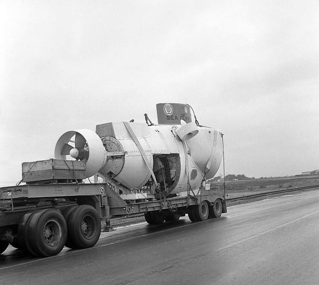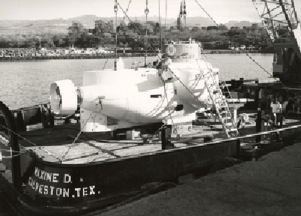 68k | One of two titanium hemispheres of the Sea Cliff (DSV-4) being lowered into the welding facility, basically a clean room. The TITANS Project of the early 70's explored the possibility of welding thick sections of titanium materials outside of a chamber. As a result of this project, two titanium spheres were fabricated from 1.92" thick 6Al-2Cb-1Ta-0.8Mo titanium alloy. One sphere was sent to the David Taylor Researcher Center for extensive testing. The other was installed to the deep submersible Alvin(DSV-2) which increased its operational depth from 7,500 feet to 13,125 feet. Initially designed and build by Electric Boat Division of General Dynamics Corporation at Groton, Connecticut, Sea Cliff (DSV-4) and her sister submersible Turtle (DSV-3) were launched on 11 December 1968. Both vehicles had personnel spheres of HY100 steel, vehicle frames of aluminum and were capable of depths of 7,500 feet. During an extensive overhaul, Turtle was later up-dated to an operational depth of 10,000 feet. This was accomplished by installing the sphere that was in Alvin. In June 1983, Sea Cliff began an extensive conversion at Mare Island Naval Shipyard, in Vallejo, California, that would last 7 months. The conversion included the detailed design and qualification of each system and component on the submersible for service to a depth of 20,000 feet. The personnel sphere at 20,000 feet will see a pressure of 8800 pounds per square inch and the sphere will not deform in anyway. Sea Cliff now features a titanium personnel sphere (2.87 inches thick 6Al-2Cb-1Ta-0.8Mo titanium alloy and is about 6.5 feet in diameter.) the personnel sphere is mounted in a 6AL-4V titanium alloy vehicle frame. The upgraded Sea Cliff would be 4.5 feet longer, now measuring 31 feet in length, by 10.5 feet wide and 12.5 feet high and 58,000 pounds. Sea Cliff, with her crew of three and capable of diving to 20,000 feet will have access to 98% of the world's ocean floor. This inner-space ship is capable of exploring an area roughly six times the surface area of the moon. Sea Cliff is used primarily for deep ocean object recovery, search and scientific research. Sea Cliff is classified as a "manned, non-combatant, untethered submersible". Sea Cliff is powered by silver-zinc batteries that energize her electrical systems and side-pod propulsion units. These side-pods are trainable through 360 and provide exceptional maneuverability. The batteries also energize two hydraulic power units that power the stern propulsion unit for cruising along the sea floor as well as a variety of other functions. Her life support system has an endurance that far exceeds the 16 hour mission profile. Sea Cliff became fully operational in 1984 and relieved Trieste II (DSV-1) as the nation's deepest diving vehicle. Trieste II is now on permanent display at the Naval Undersea Museum at Keyport WA. A little history on Alvin: In 1964, General Mills/Litton Industries, Minneapolis Minn. under contract to the U.S. Navy, built the deep submersible capable of diving 7,500 feet. Alvin's personnel sphere was fabricated from HY100. Alvin's personnel sphere was upgraded to titanium in the mid 1970's. Alvin is operated by Woods Hole Oceanographic Institution. In 1966 an American bomber collided with its tanker during in-flight refueling off the southern coast of Spain. Four of the five H-bombs on board the bomber fell harmlessly on land and were recovered. The fifth fell into the sea and initiated another Thresher-type operation to find and retrieve the 1.1 megaton bomb. Alvin located the parachute shrouded bomb on the ocean floor at 2,250 feet and attached a lift line which broke during retrieval and started the search anew. When the bomb was relocated, it was now at 2,850 feet. A remotely operated vehicle (ROV) was used to attach another lift line, in the process of hooking up the lift line the ROV became entangled in the bomb's parachute. The bomb and the ROV were retrieved, thus ending 80 days of search/recovery efforts. In 1968, a near-tragic event occurred a few hundred miles off Cape Cod. In the process of launching Alvin, a lift cable on Alvin's cradle snapped and Alvin fell into the sea and sank 5,500 feet to the ocean floor. Miraculously, the crew scrambled out before the vehicle sank. The following summer, the Aluminaut was able to put a lift hook on Alvin's open hatch and Alvin was pulled back to the surface. The Aluminaut has a design depth of 15,000 feet. Whereas most submersibles are made of steel, this one was made of aluminum. Too large to be transported by a mother ship, Aluminaut must be towed to the diving site. One of the largest submersibles, she could carry a crew of six for three days. A little history on Trieste II: In 1962 the U.S. Navy undertook the development of an improved bathysphere. This project was sponsored by the Naval Electronics Laboratory in San Diego CA and resulted in the construction of Trieste II. The design and construction was accomplished by Mare Island Naval Shipyard in Vallejo, CA. Reliability and safety were fundamental requirements. Trieste II was designed to carry either the Terni (20,000 ft.) or the Krupp (36,000 ft) sphere. The propulsion system, which consisted of two electric motors delivering 5 horsepower each to the propellers, provided an endurance of 8 hours at 2 knots using lead-acid type batteries. Interesting facts about a bathysphere as compared to submersibles and submarines: Unique Engineering Problems: For the submerged condition, the equilibrium of a bathysphere is governed by the well known principle of Archimedes relating weight and displacement. Many conventional submarine design techniques are applicable to a bathysphere but there are a number of unique engineering considerations. The basic difference between submersibles, submarines and a bathysphere is that most of the submersibles submarine's buoyant volume is made up of air while the buoyant volume of a bathysphere is principally a light wei