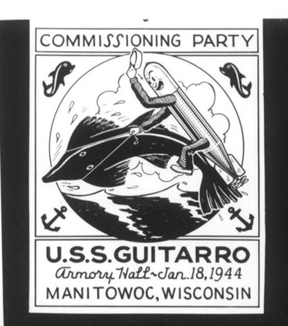 ![]() | 36k | Commissioning party emblem of the Guitarro (SS-363), at Manitowoc Shipbuilding Co, Manitowoc, WI., 18 January 1944. | Editors Note: There are over 200 images submitted on these pages covering the following submarines that were constructed at the Manitowoc Shipbuilding Co, Manitowoc, WI,: SS-265 through SS-274, and SS-361 through SS-380. None of them would have seen the light of day if it were not for the efforts of Curator, Asst. Director, Bill Thiesen and Larry Bohn who sent them to NavSource for publication. A special debt of gratitude is owed to these two men and the Wisconsin Maritime Museum, home of the Cobia (SS-245), for allowing these photographs to be seen by the lovers of naval history worldwide. | |