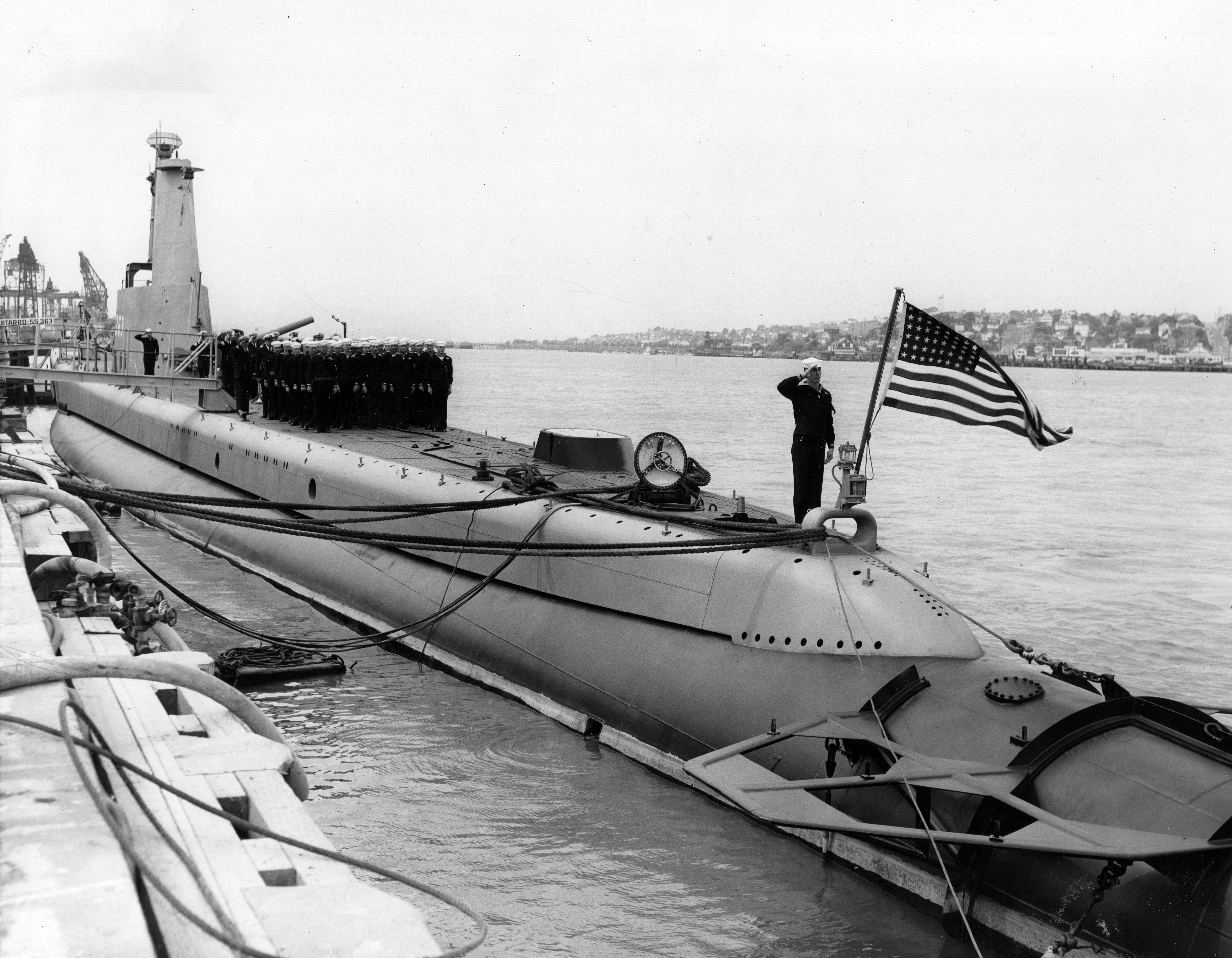 ![]() | 2.20k | Colors raised. The crew & officers of the newly commissioned submarine Guitarro (SS-363) salute the U.S. flag after it was raised over the ship at Mare Island on 15 May 1954. The Guitarro is due to be turned over to the Turkish Navy in two months. | Photo courtesy of Vallejo Times Herald via Darryl L. Baker. | |