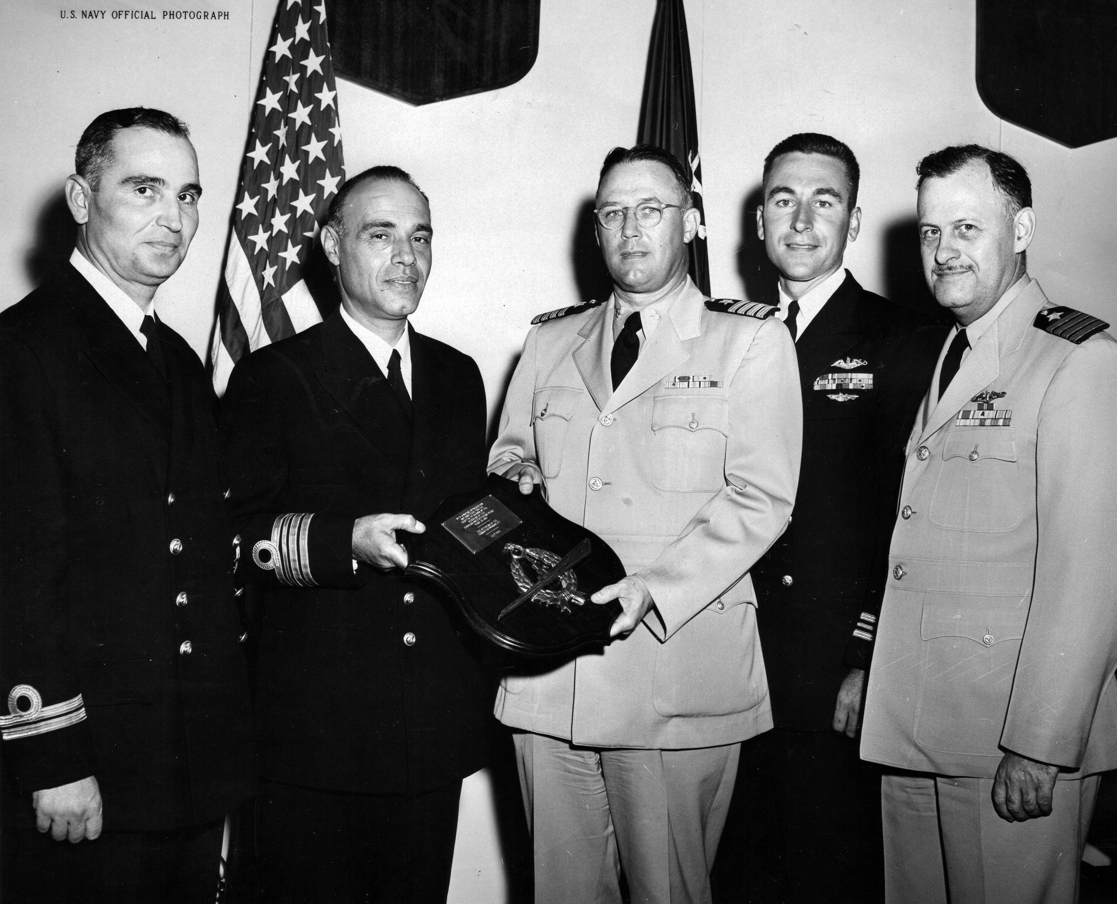 ![]() | 947k | Officers of the Turkish Navy present a plaque in appreciation for the hospitality shown by the shipyard and its officer mess in late July 1954. Left to right: LT Nazmi Erkan (Turkish PCO), Capt. Ferit Denizman (Turkish Sub Flotilla Commander), Capt. James H. Rodgers (Shipyard Commander), LCDR Paul L. Lacy (CO of Guitarro (SS-363)) and Capt. H. J. Carpenter (Shipyard Admin Officer). | Photo # 22115-7-54 TH courtesy of the Vallejo Naval & Historical Museum via Darryl L. Baker. | |