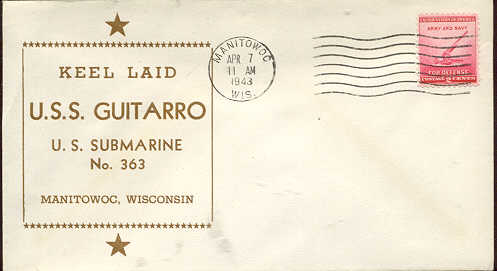 ![]() | 16k | Commemorative post mark on the occasion of Guitarro's (SS-363) keel laying, 7 April 1943. | Courtesy of Jack Treutle (of blessed memory). | |