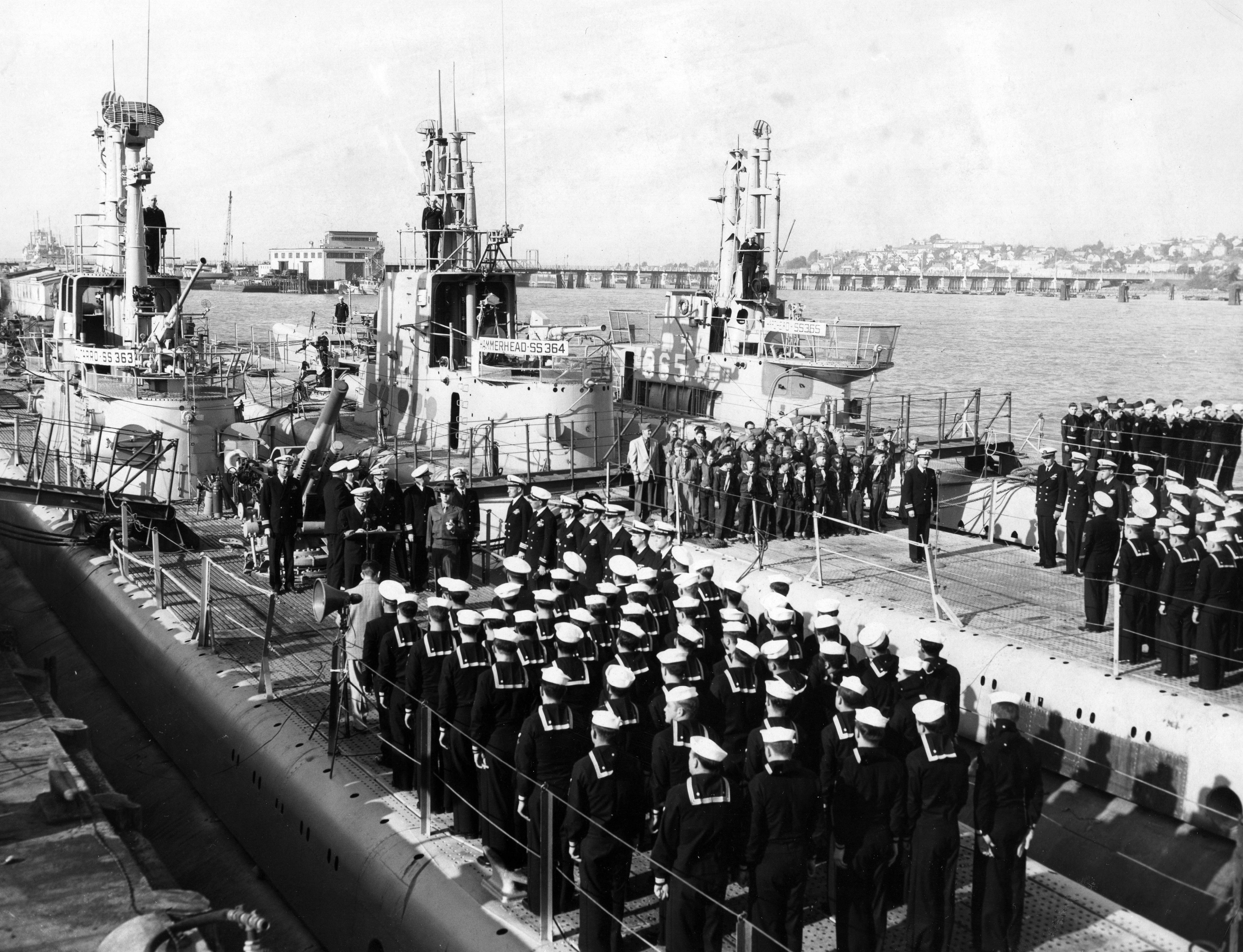 ![]() | 2.10k | Multiple submarine re-commissioning at Mare Island on 6 February 1952. Guitarro (SS-363) is the submarine to the left, outboard of her is Hammerhead (SS-364), and Hardhead (SS-365). | USN photo # 11787-2-52, courtesy of Darryl L. Baker. via Vallejo Naval and Historical Museum. | |