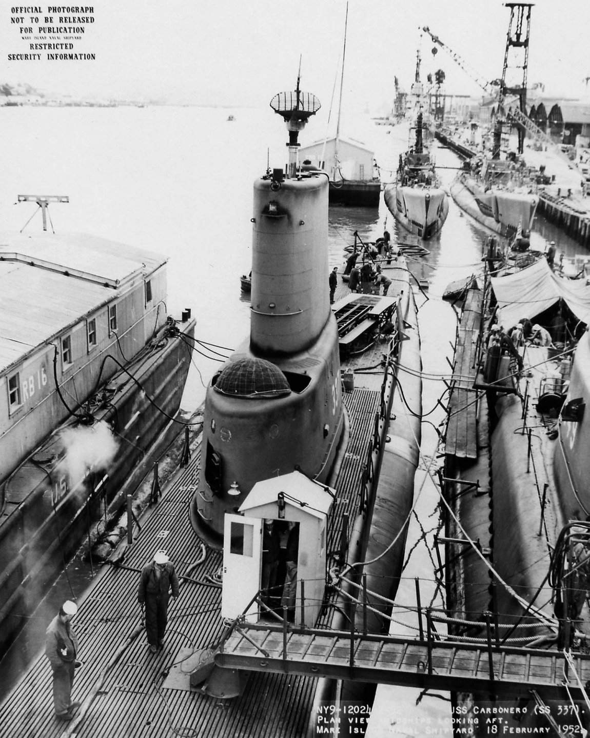 ![]() | 213k | Forward plan view looking aft of Carbonero (AGSS-337) at Mare Island on 18 February 1952. She is outboard of Diodon (SS-349) and Guitarro (SS-363), Hardhead (SS-365) and Juneau (CLAA-119) are aft. Note Loon launcher on the after deck. | USN photo # 12024-2-52, courtesy of Darryl L. Baker. | |