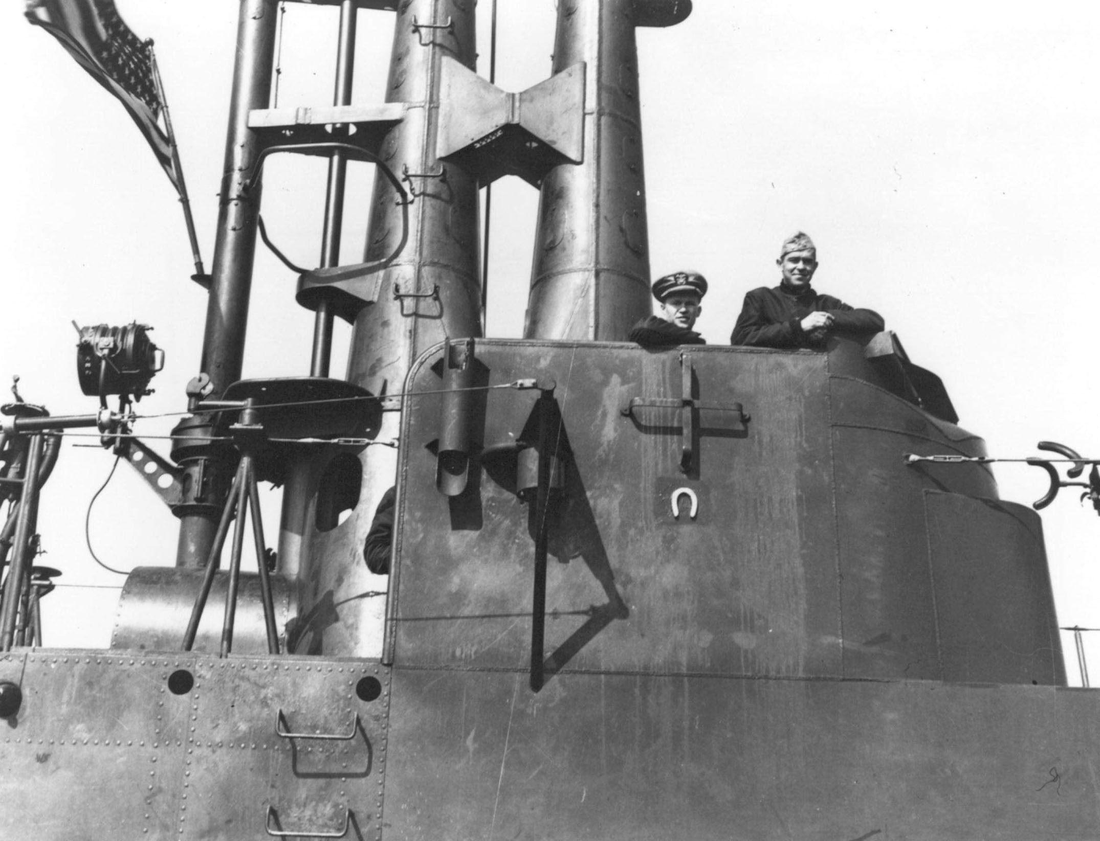 ![]() | 294k | A strong breeze blows Old Glory on the bridge of the Hardhead (SS-365), on sea trials on Lake Michigan, April 1944. | USN photo courtesy of ussubvetsofwwii.org | |