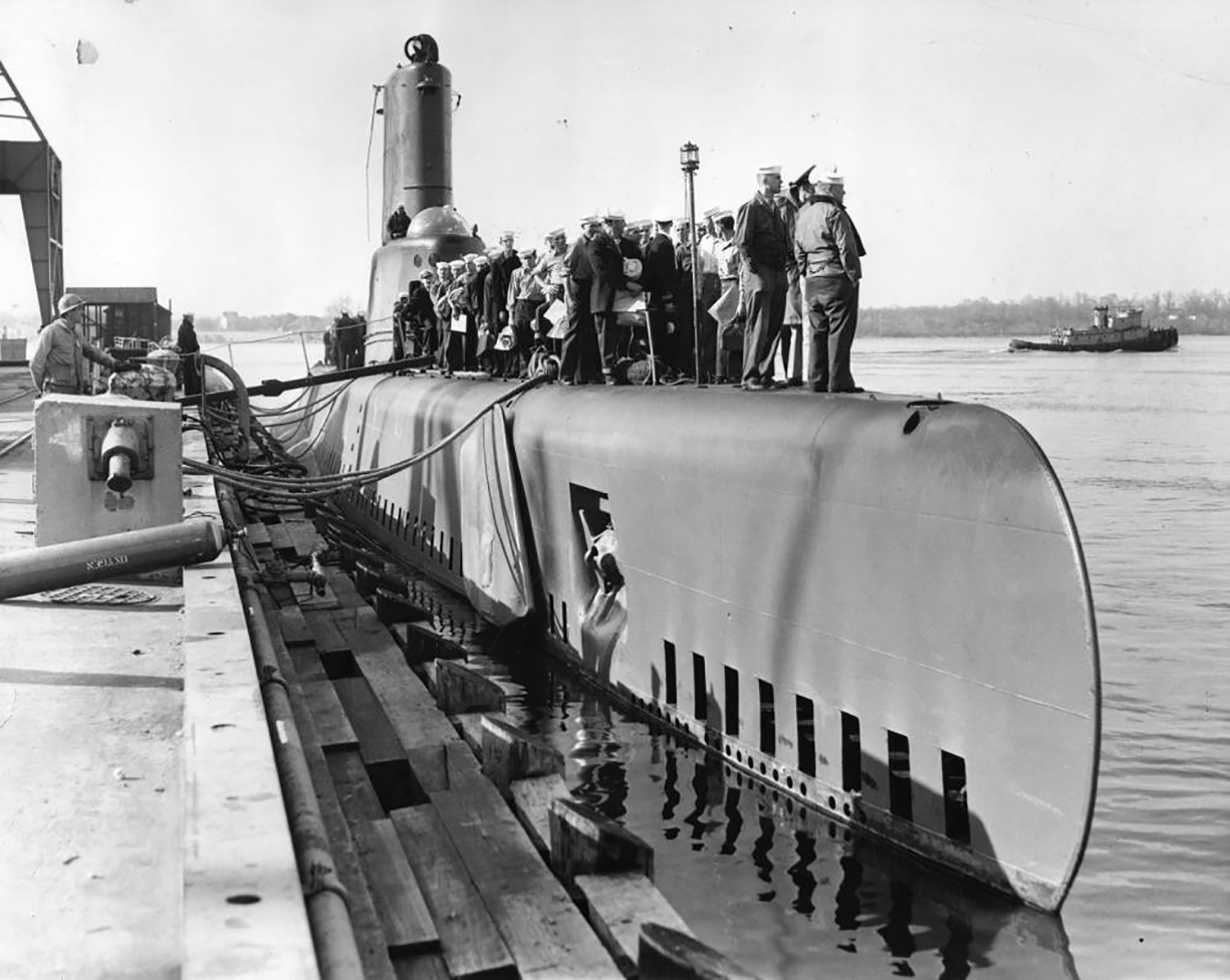 ![]() | 438k | "Navy reservists go to sea in submarine", 17 April 1955. "Sailors of the U.S. Naval Reserve board the Hardhead (SS-365) at the Philadelphia Naval Base for a weekend training cruise. The underwater craft, which came from New London, Connecticut, for an overhaul, is a veteran of action in the Pacific Ocean during World War II." | Photo courtesy of the George D. McDowell Philadelphia Evening Bulletin Photographs @ digital.library.temple.edu | |
