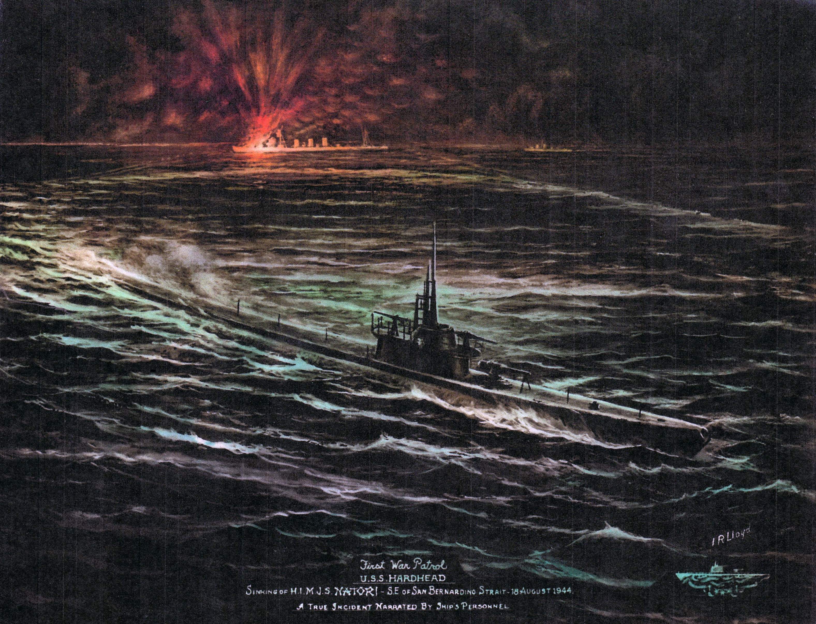 ![]() | 1.32k | Hardhead (SS-365) departed on her first war patrol 27 July 1944 and proceeded to her patrol area off the Philippines. Early 18 August, she detected Japanese light cruiser Natori east off San Bernardino Strait, and closed for a surface attack. The first well directed salvo stopped the cruiser dead in the water; a second sank her to the bottom. I. R. Lloyd print of the Hardhead (SS-365) sinking the Natori. |