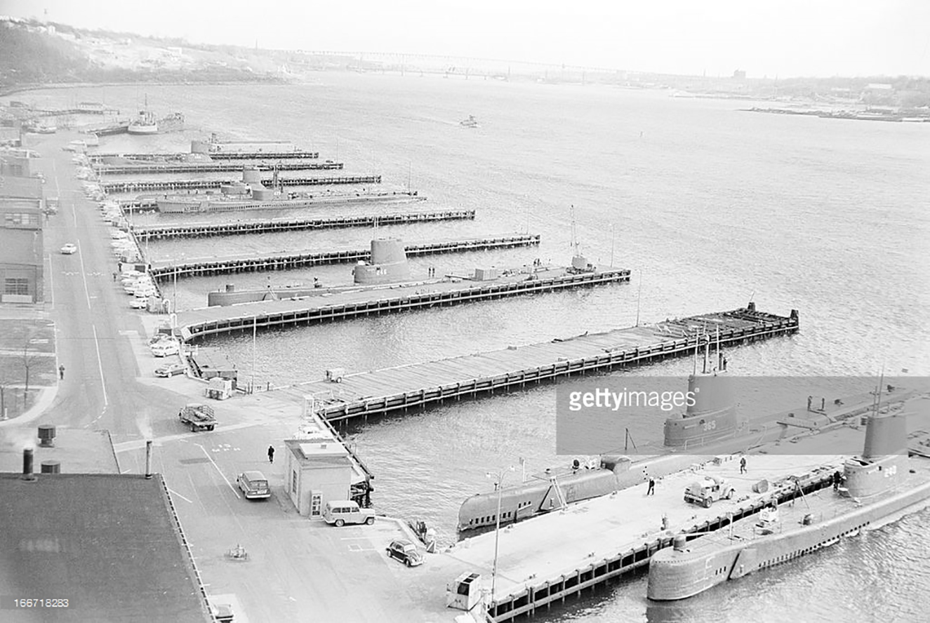 528k | Moored boat off New London at the time of the Thresher's (SSN-593) sinking. From right to left: Bream (SS-243), Hardhead (SS-365), Croaker (SSK-246) & Conger (SS-477). After this, the resolution becomes too fuzzy. | Photo i.d. courtesy of David Johnston (USN, retired) Photo by Paul Slade/Paris Match via Getty Images, courtesy of gettyimages.com. | |