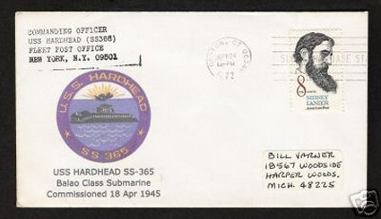 ![]() | 21k | Commemorative postal cover of the Hardhead (SS-365) with the boat's patch in April 1972. | Courtesy of Jack Treutle (of blessed memory). | |