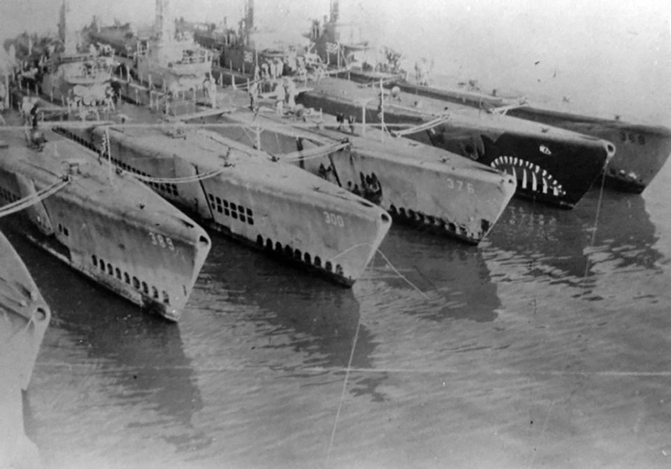 40k | Inboard of the Sperry (AS-12) lie the Tilefish (SS-307) , Brill (SS-350), Trepang (SS-412), Jallao (SS-368), Spot (SS-413) , and Lizardfish (SS-373), late 1945 - early 46. The history of the Jallao can be viewed here. |