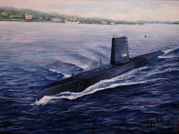 ![]() | 75k | Acrylic on canvas by the artist William RaVell III depicting the Jallao (SS-368) outbound on the Thames River, Groton, CT having departed the Groton Submarine Base (not visible) and is passing the U. S. Coast Guard Academy, New London, CT, on her starboard side. The painting is based on the below photo. | Photo & text courtesy of subart.net. | |