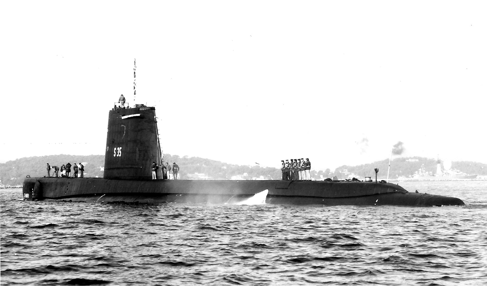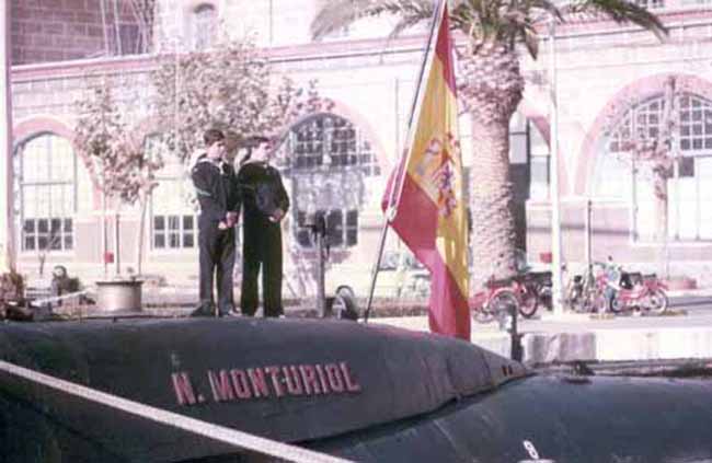 ![]() | 55k | The Spanish flag flies from the stern of the Narciso Monturiol (S-35), circa 1980. | Photo courtesy of perso.wanadoo.es. | |