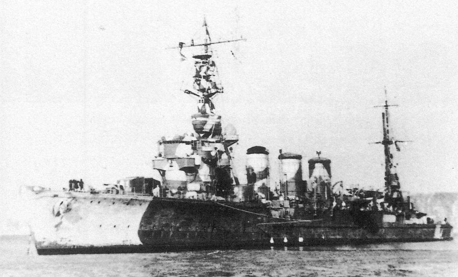 130k | The light cruiser HIJMS Tama at anchor, February 1942. Tama is wearing a camouflage scheme that helped foreshorten the hull, with irregular stripes on funnels and superstructure. Colour scheme is made up of Black, mid-grey and white colours. Damaged 25 October 1944 by aircraft from Essex (CV-9) and Lexington (CV-16); torpedoed the same day 320 miles NE of Cape Engano (21 degrees 32' N, 129 degrees 17' E) by the submarine Jallao (SS-368). | Photo courtesy of Kazushige Todaka via Robert Hurst. | |