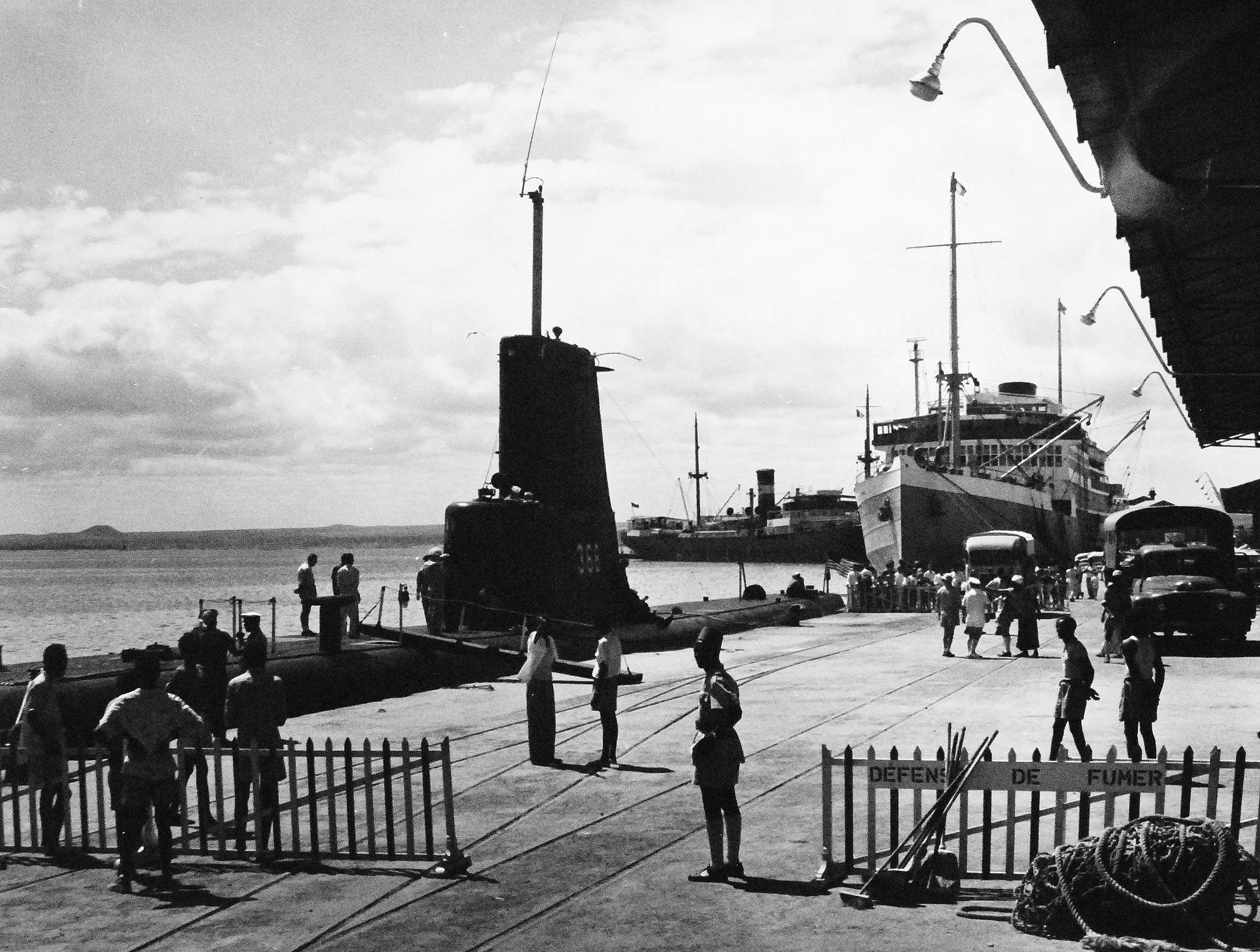 1.43k | Jallao (SS-368) while moored at Djibouti, French Somaliland. French coast natives watch the entire proceedings with a dubious eye, 15 February 1956. Jallao began a three-month 18,000 mile goodwill cruise home from the Mediterranean, on 20 January after completing a tour of duty with the United States Sixth Fleet. She departed from the island of Malta en-route to the Suez Canal, the Red Sea, African ports on the Indian Ocean and the Cape of Good Hope. After rounding the cape, she will cross the Atlantic and visit South American countries en-route to North to her home port of New London, Connecticut. This is the first such cruise to be made by a U.S. Navy submarine is in line with Navy policy of having U.S. ships visit foreign ports where the crews may enjoy liberty and recreation. The initial itinerary of the Jallao was: Port Said, Egypt; Massawa, Ethiopia; Djibouti; French Somaliland; and Capetown, Union of South Africa. | USN photo # USN 686490, courtesy of the National Museum of the U.S. Navy, via flickr.com. | |