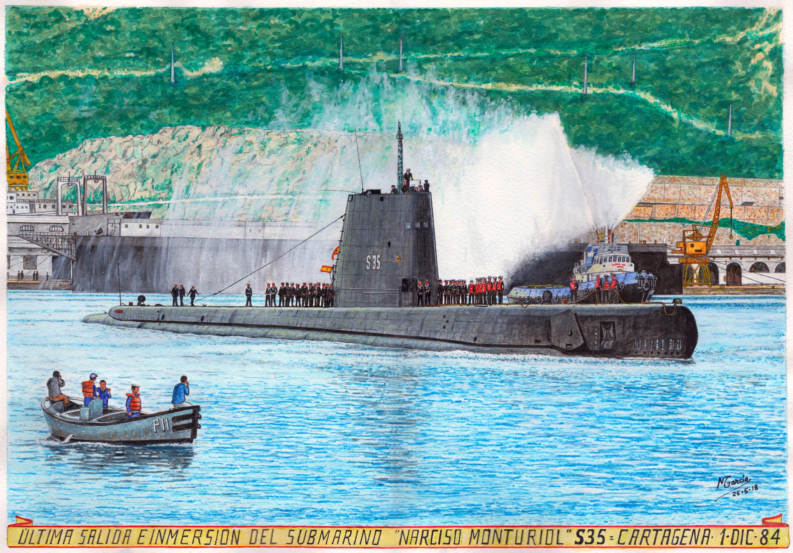 ![]() | 898k | Narciso Monturiol (S-35) watercolor by Manuel García García, depicting the Spanish submarine Narciso Monturiol (S-35), returning to Cartagena for the final time, 1 December 1984, after her final dive earlier that same day. | Photos courtesy of Manuel García García via Fabio Pena. | |