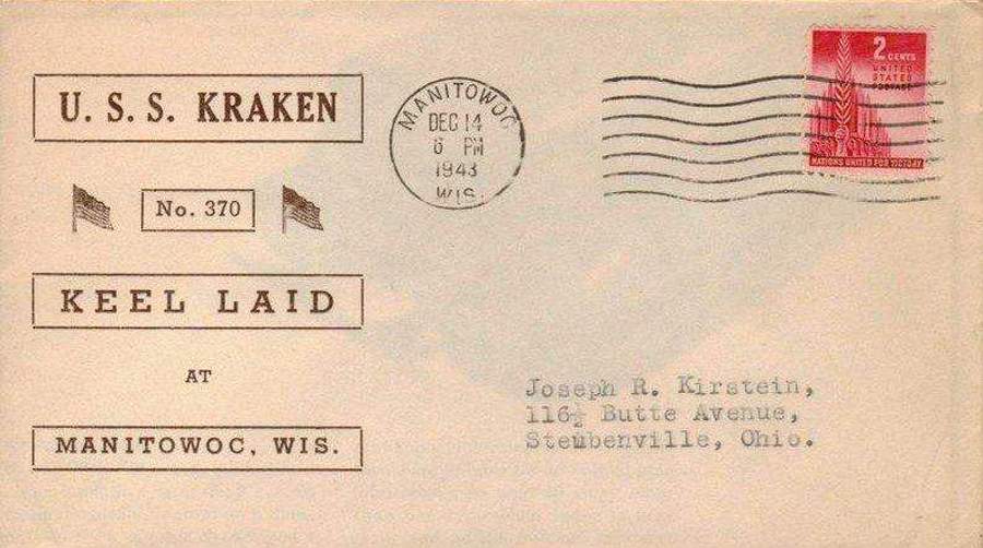 67k | Commemorative post cover issued on the Kraken's (SS-370) keel laying, 13 December 1943, at Manitowoc Shipbuilding Co., Manitowoc, WI. Note that the cancellation date is the 14th of December. |