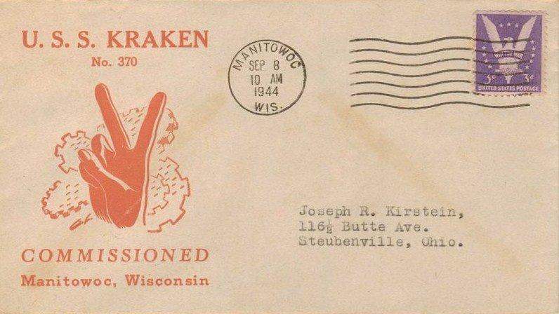 59k | Commemorative post cover issued on the Kraken's (SS-370) commissioning, 8 September 1944 at Manitowoc Shipbuilding Co., Manitowoc, WI. | Photo courtesy of Paul Petosky. | |