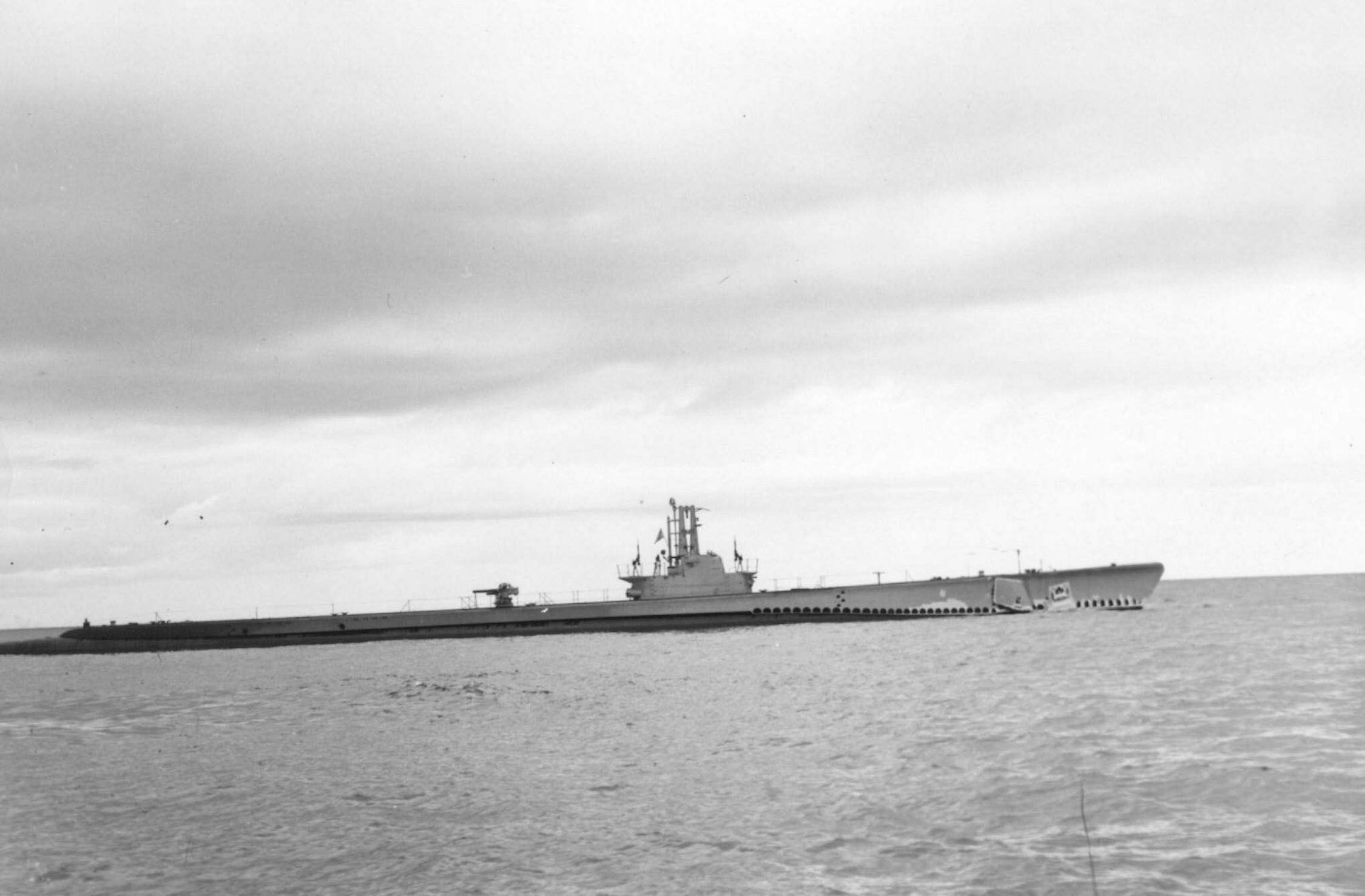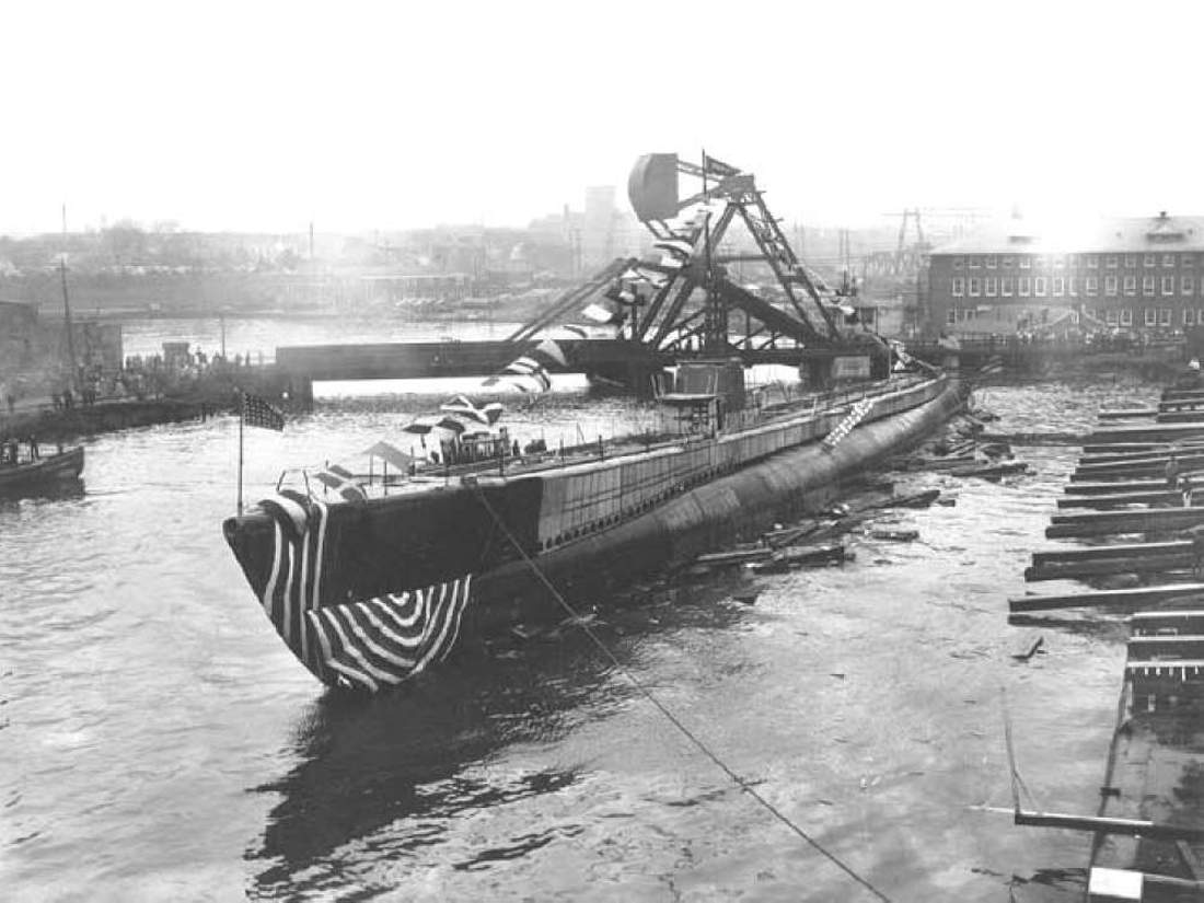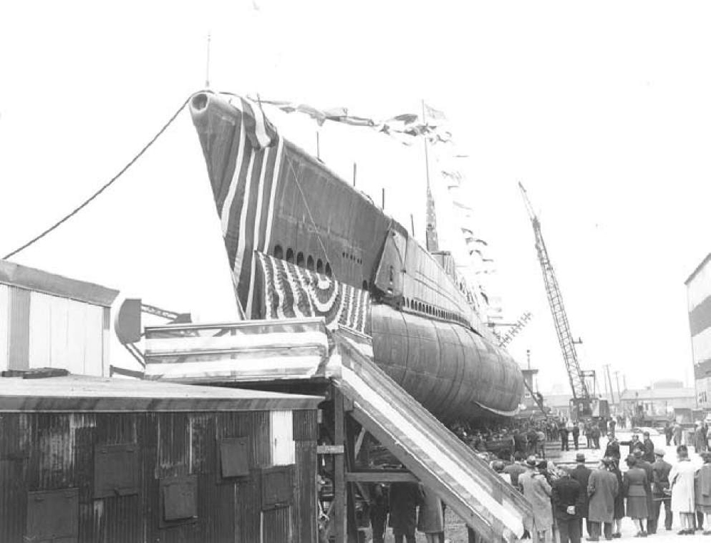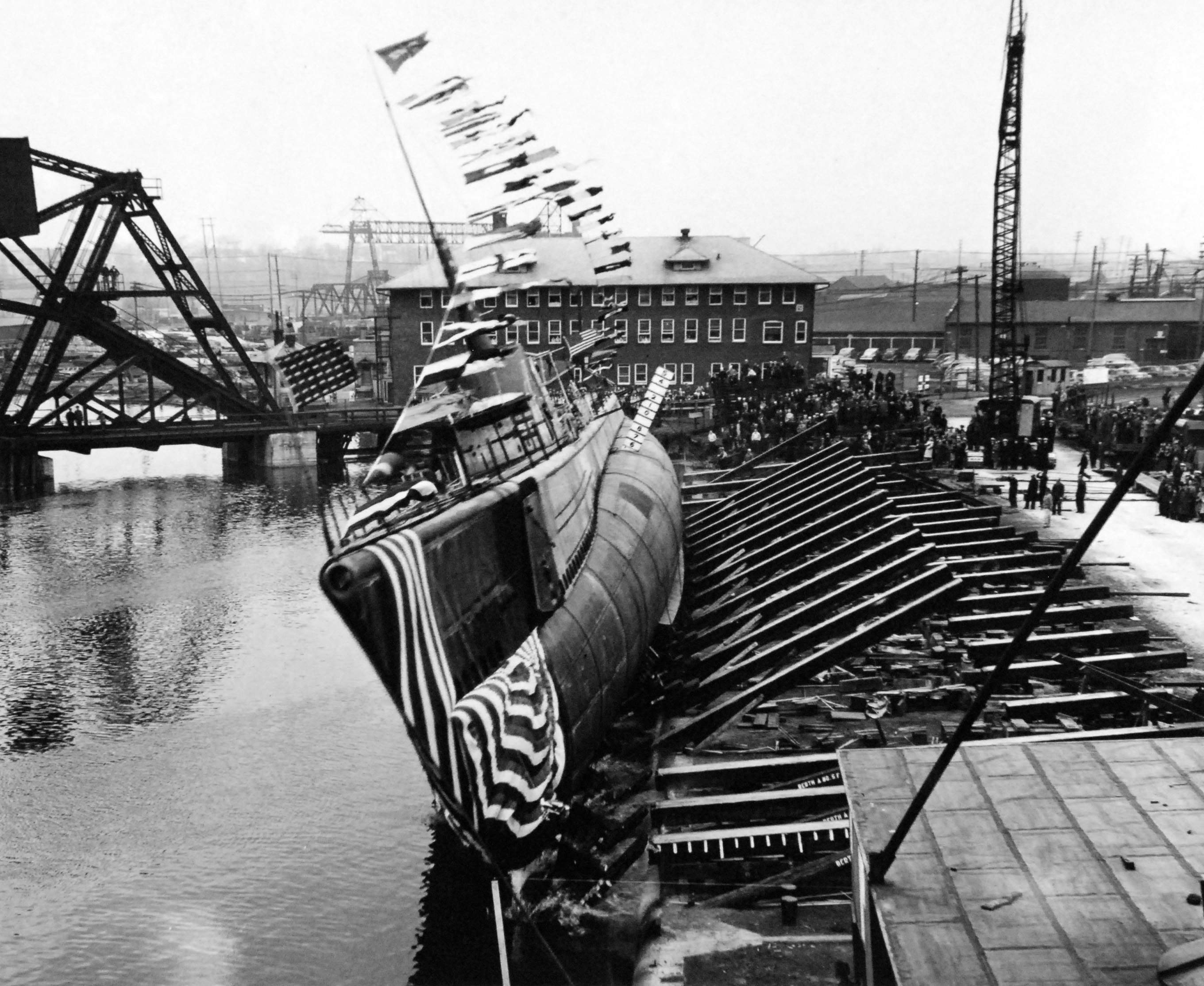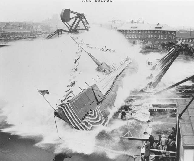 ![]() | 585k | All flags on Kraken (SS-370) fly fully as she is launched. | USN photo # 80-G-409528 courtesy of National Museum of the U.S. Navy. | |