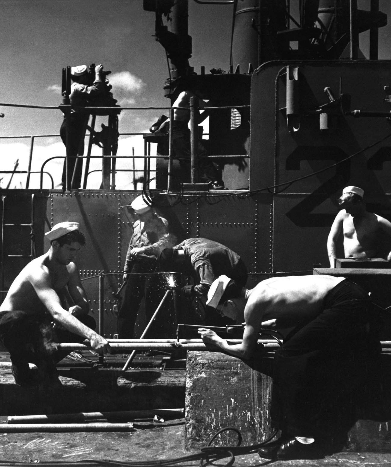 ![]() | 440k | Text accompanying this photo reads "Enlisted men repair and check instruments aboard a submarine just returned to Pearl Harbor, Hawaii. May 1945." Note: Many of the captions of Bristol's photography are lacking in details and some have the wrong dates, places and locations. The "23" boat in question in this photo is definitely NOT the S-23 (SS-128). It is beyond a doubt a Salmon or Gato/Balao class fleet boat, and I would lean toward a Balao. The date of the photo is probably early to mid 1944. The boat in question has the characteristicly fat, twin periscope shears and long, wide flat "cigarette" deck of a Balao. Directly above the head of the sailor who is working at the base of the aft scope is a radar mast. The sailor behind him is standing at and looking through the aft Target Bearing Transmitter (TBT). Barely visible on the far left of the photo is what I believe to be part of a 20 mm gun mount. None of these features were ever present on any of the S-boats, even the later 40 series that were heavily modified (i.e. S-45 (SS-156) ) towards the end of the war. The whole conning tower fairwater on the boat in question is simply too large for a S-boat. As for the "23" on the fairwater, I have seen wartime photos of fleet boats displaying mysterious one and two digit numbers that do not correspond to their hull number (see the Guardfish (SS-217) and Peto (SS-265) pages for examples). Despite a lot of research, I have not turned up an official explanation for these strange numbers. One source said that they were squadron or flotilla identifiers, but I can't back this up officially. It is possible that they were temporary numbers assigned while the boats were in home waters, maybe to cut down on friendly fire incidents. Strangely enough, these numbers also seemed to have been used briefly during WWI, as I have seen them on D, E, F, G, and H-class boats. It is also entirely possible that these numbers are part of an official disinformation program designed to obscure the identities of the boats while allowing a wide distribution of photos to an information hungry wartime public. That would also account for the information inaccuracies attributed to otherwise highly thought of photographers. Riveted construction on the conning tower fairwaters of the fleet boats was far more common than I previously thought. It seems that the fairwater plating was riveted to the supporting structure underneath during construction on virtually all of the fleet boats, no matter who built it. This was possible due to the fact that the fairwater was non-watertight and merely provided for a smooth flow of water around the conning tower and lower periscope shears. Riveting was a long practiced and well known construction method, while welding was still relatively new and there was a fairly low number of skilled and experienced welders, and they had to be parceled out carefully depending on priority. All of the pressure resisting elements such as the conning tower and the main pressure hull were welded. The last fleet boat to have a riveted pressure hull was the Pompano (SS-181) in 1937. These original riveted fairwaters were retained until the end of the war, unless the boat had major rework of the fairwater performed (like most of the Gato's), or if the boat suffered battle damage. The rework jobs seemed to have been mostly welded. I would lay money on it being a Manitowoc built Balao class and I will stick with the early to mid 1944 date. |