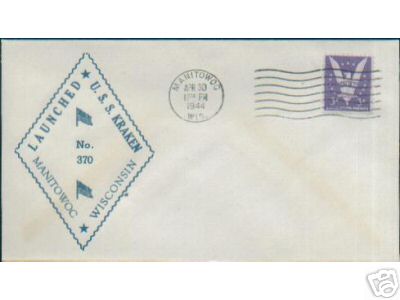 ![]() | 15k | Commemorative postal cover on the occasion of Kraken's (SS-370) launching at Manitowoc Shipbuilding Co., Manitowoc, WI., 30 April 1944. | Courtesy of Jack Treutle (of blessed memory). | |