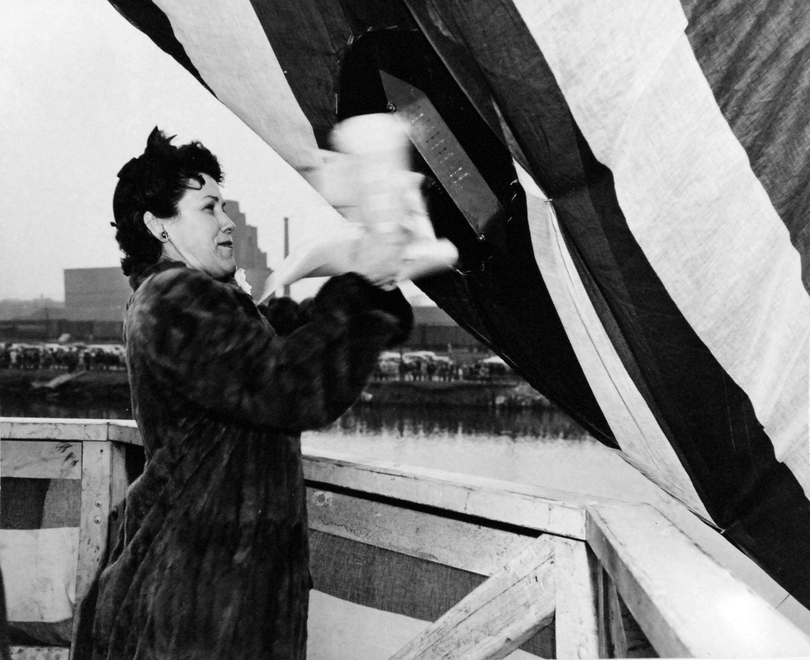 ![]() | 422k | The first crack at Kraken (SS-370) is done by her Sponsor, Mrs. John Z. Anderson at launching at the Manitowoc Shipbuilding Company, Manitowoc, Wisconsin, 30 April 1944. | USN photo # 80-G-409527 courtesy of National Museum of the U.S. Navy. | |