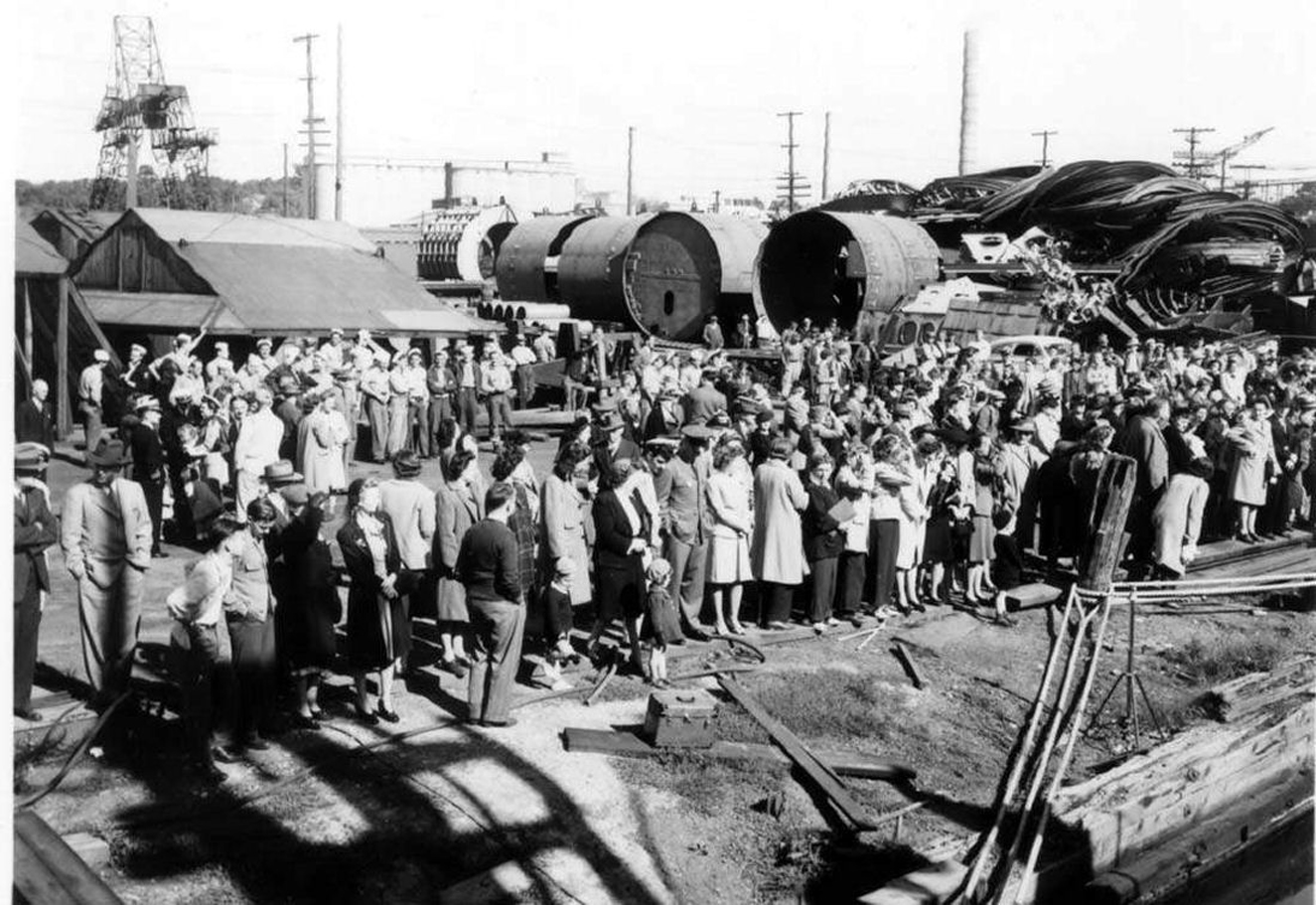 Courtesy of Bob Peppard & Photo by Harry Berns, Official photographer of the Manitowoc Shipbuilding Co., Manitowoc, WI. Submitted by Larry Bohn, courtesy of the Wisconsin Maritime Museum, home of the Cobia (SS-245) | |