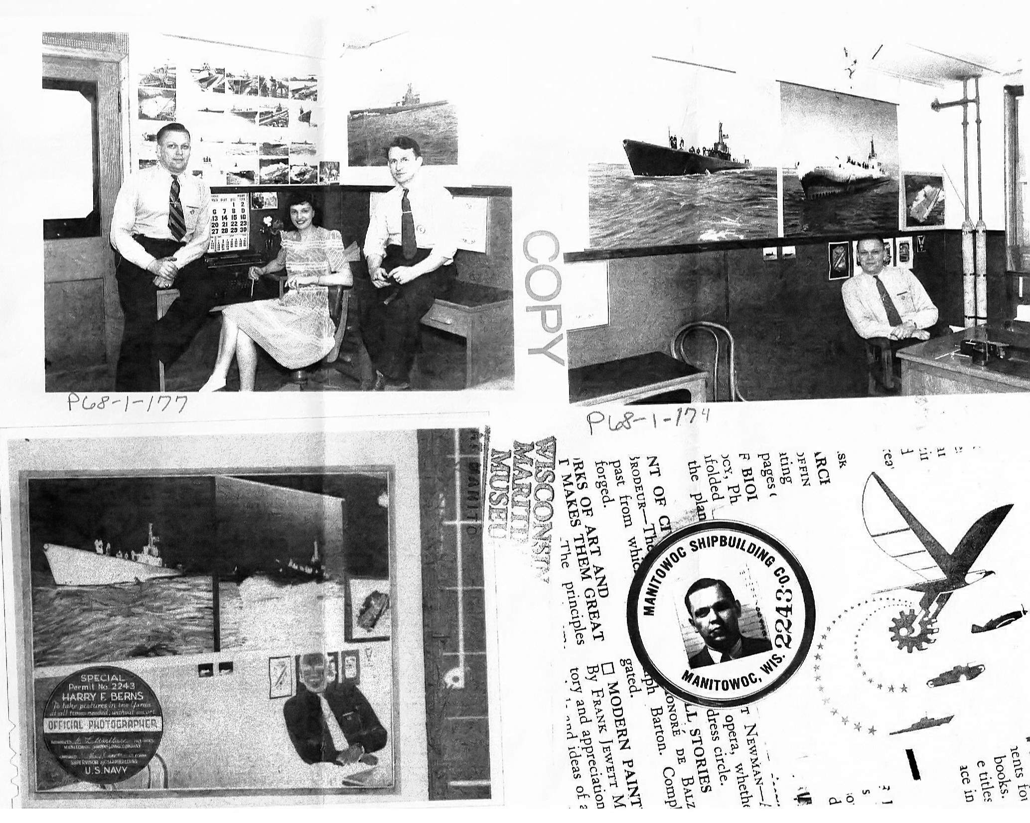 ![]() | 485k | Photo of Harry Berns, Official photographer of the Manitowoc Shipbuilding Co., Manitowoc, WI. The photo of the Golet (SS-361) encased in snow appears on the wall above him on the upper right. His obituary appears here. | Photo courtesy of Susan Menk, Archives Assistant, Wisconsin Maritime Museum, Dee Anna Grimsrud,Reference Archivist, Wisconsin Historical Society, Steve Khail, CBC, Director of Investor Relations & Corporate Communications, The Manitowoc Company, Inc. & William Young. | |
