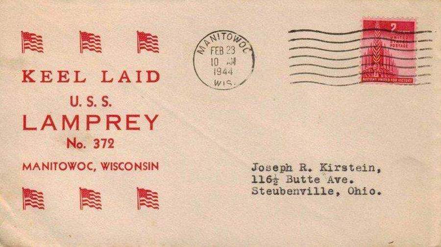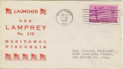 71k | Commemorative post cover issued on the Lamprey's (SS-372) keel laying, 22 February 1944, at Manitowoc Shipbuilding Co., Manitowoc, WI. Note that the cancellation date is the 23rd of February. |