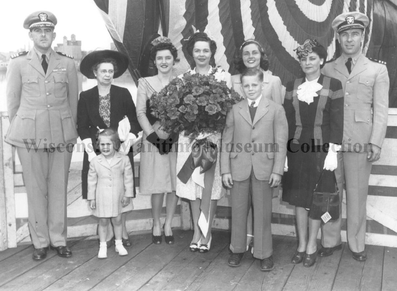 ![]() 0837215 | 495k | Mrs. W.T. Nelson, sponsor of the Manitowoc built submarine Lamprey (SS-372) with family group on launching platform at Manitowoc Shipbuilding Company on 18 June 1944. | Photo by Harry Berns, Official photographer of the Manitowoc Shipbuilding Co., Manitowoc, WI. This photo # P70-7-537, can be ordered from the Wisconsin Maritime Museum. |