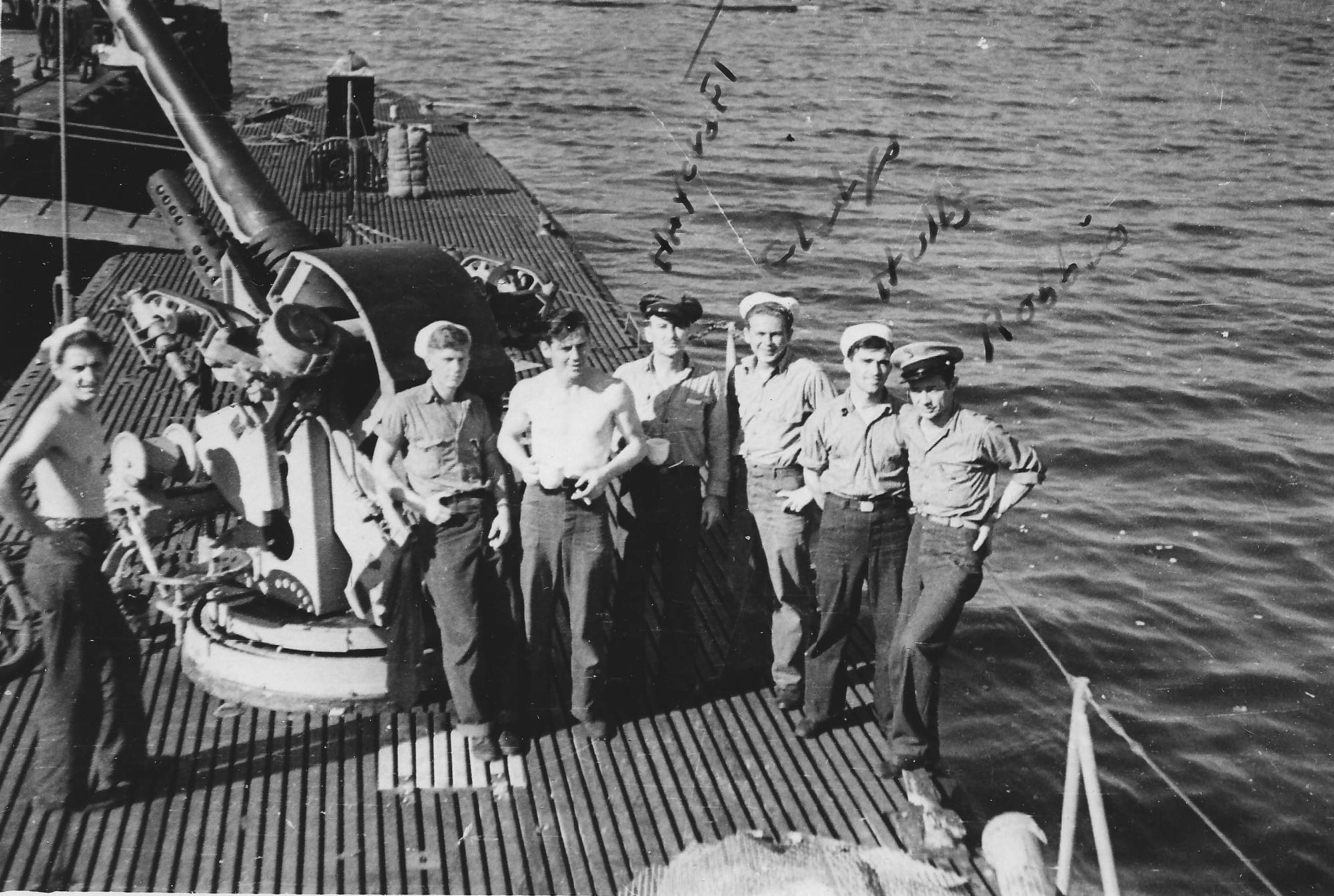 ![]() 0837222 | 363k | William D. Morast shirtless in center with buddies on deck of the Lamprey (SS-372). | Photo courtesy of William D. Morast, plankowner, via his son Steve Morast. | |