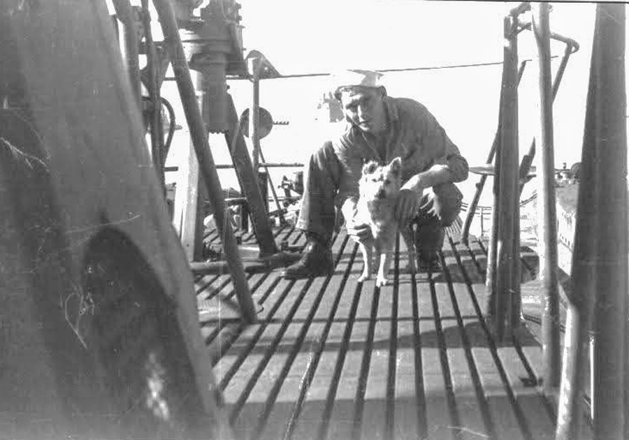 ![]() 0837223 | 283k | Around Perth, Australia, after the Lamprey's (SS-372) first war patrol, the crew picked up a dingo and brought it back to the sub. They named him Gilley after a popular drink the sailors concocted in Australia from steam powered torpedo fuel. There was an oil added that would make you sick if you drank it. The sailors made crude stills to make it drinkable. Called gilley stills the resulting drink was called Gilley. Add pineapple juice and you had Torpedo Juice. The crew taught Gilley to attack a pair of khaki pants. They would shake the pants and yell "Get it, get it". Submarine officers and chiefs wore khaki pants. When one of them would put their leg through the control room hatch the crew would tell Gilley to get it and he would grab the pantleg and shake the heck out of it. Gilley was allowed on deck for the first time after a patrol entering Subic Bay in the Philippines. The sub was maneuvering to position itself for docking. Gilley was chasing seagulls up and down the deck and chased one toward the stern. He jumped off the stern into the water after the bird. The propellers heavily churned up the waters and Gilley disappeared! Everyone was stunned thinking they had lost their dog. Suddenly a long way astern the dog popped up. They maneuvered the sub around and picked up their mascot. Gilley made two more patrols with them. When they returned to the States Gunners Mate Johnson had Gilley inspected and permitted and took the veteran dingo home with him. | Photo courtesy of William D. Morast, plankowner, via his son Steve Morast. | |