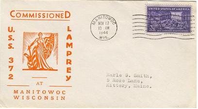 ![]() | 17k | Commemorative postal cover on the occasion of the commissioning of the Lamprey (SS-372), 17 November 1944. | Courtesy of Jack Treutle (of blessed memory). | |