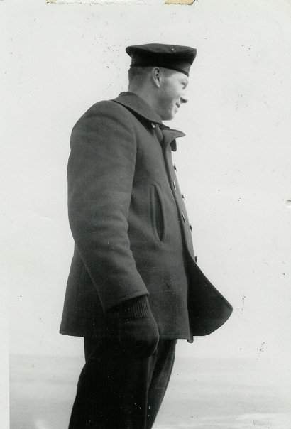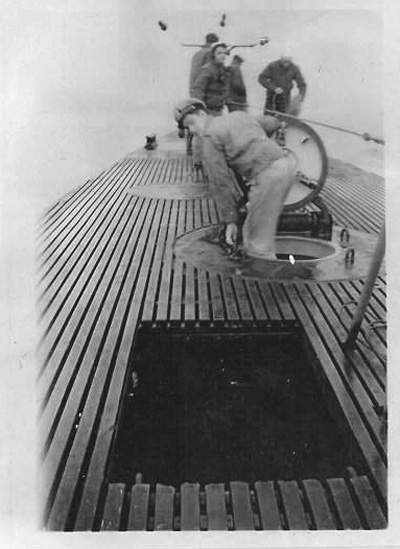 28k | Captain Ovid M. Butler of the Lizardfish (SS-373) ascending the bow. | Photo courtesy Lizardfish (SS-373) plankowner Walter H. Mead via his son, Scott Mead. | |