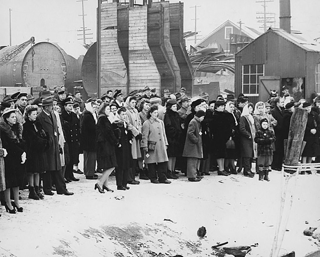 192k | A crowd of men, women, and children, all wearing winter attire, stand on the snow-covered grounds of the Manitowoc Shipbuilding Company along the Manitowoc River watching the commissioning ceremony for the Lizardfish (SS-373) on 30 December 1944. Among the group are Naval officers and crewmen, shipyard officials and workers, and family members of crewmen and workers. The Lizardfish is tied up along the river, just out of view in this picture. In the background are scrap piles of material for two unfinished submarines, Needlefish (SS-379) & Nerka (SS-380). The large cylindrical sections with the number 379 would have formed hull portions of the Needlefish . The company's contracts to build those two submarines were cancelled in July, 1944 and parts for them were scrapped. | Photo by Harry Berns, Official photographer of the Manitowoc Shipbuilding Co., Manitowoc, WI. Submitted by Larry Bohn, courtesy of the Wisconsin Maritime Museum, home of the Cobia (SS-245) | |