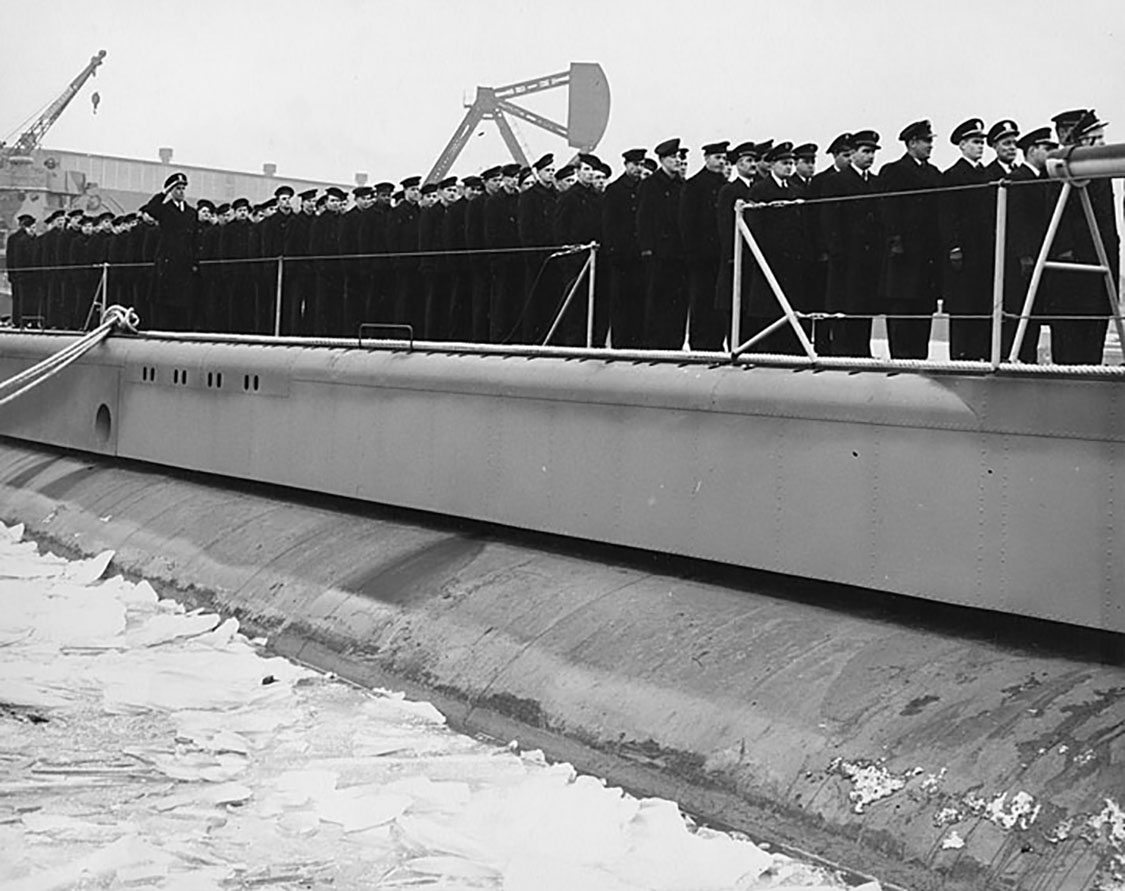 178k | Icy plankowners of the Lizardfish (SS-373) line the boat's stern during the commissioning ceremony on 30 December 1944. | Photo courtesy of the Wisconsin Maritime Museum, home of the Cobia (SS-245) | |