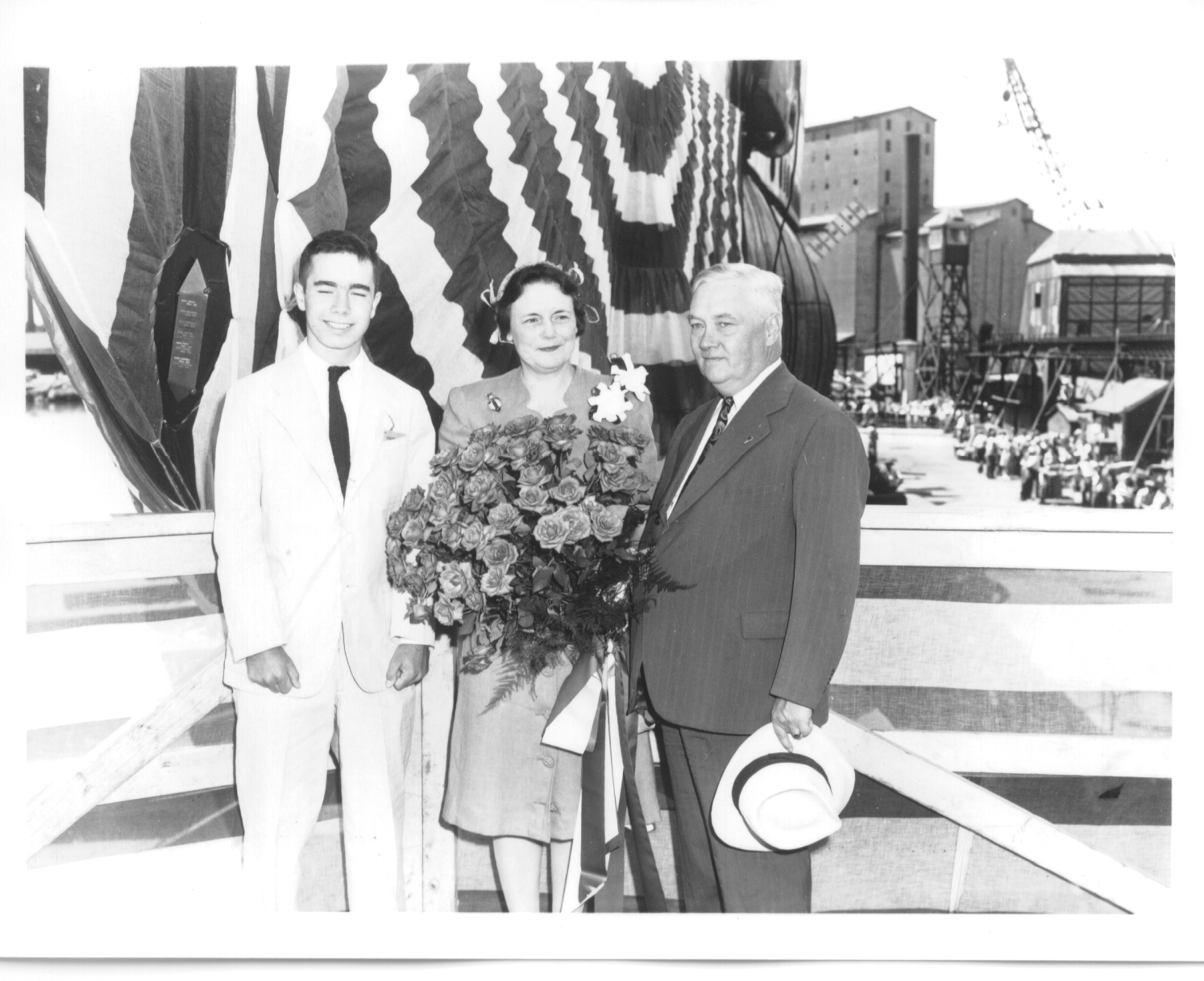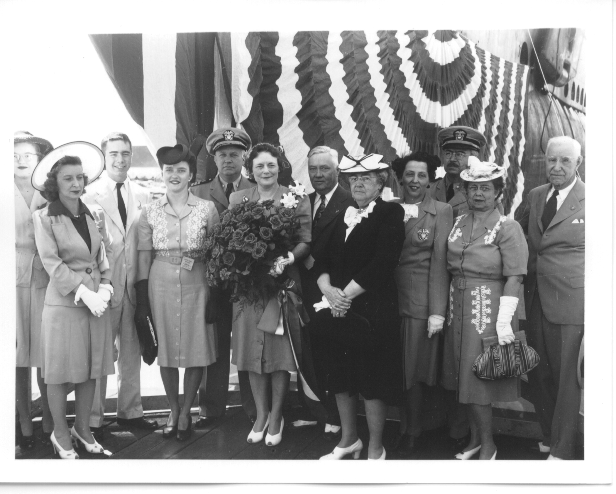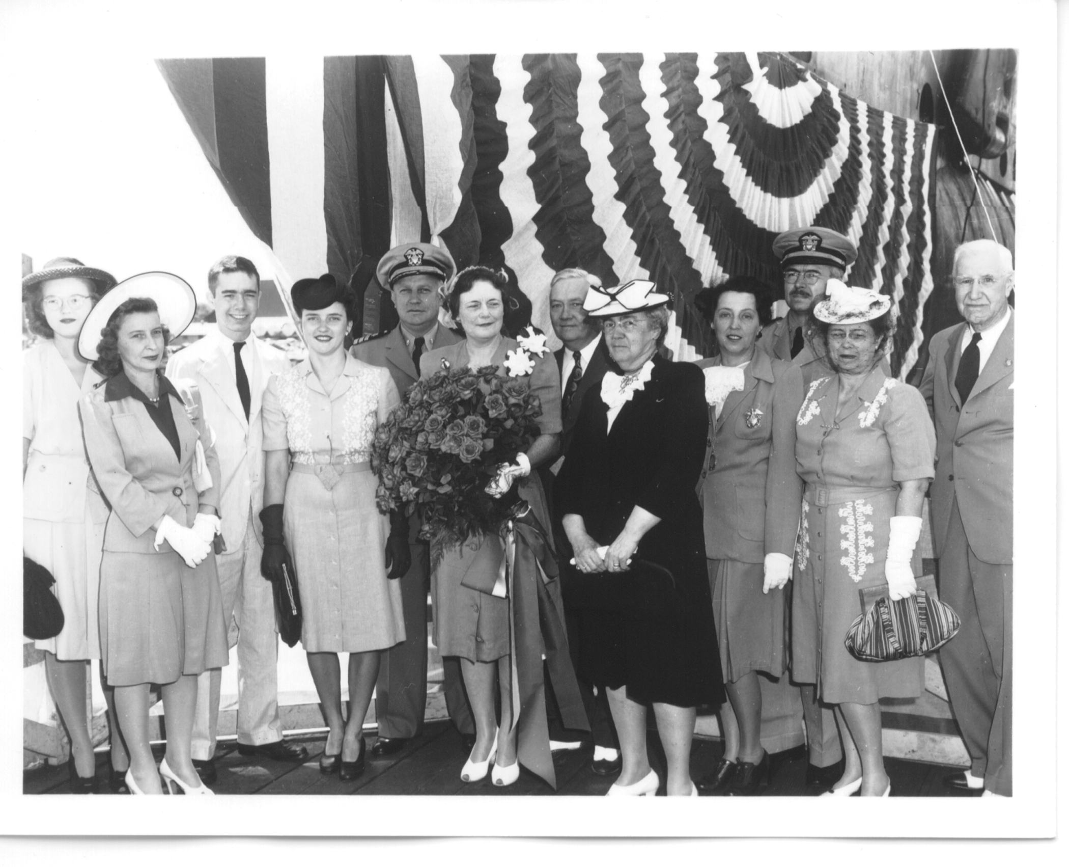 ![]() 0837323 | 1.16k | Mrs. Landsdale G. Sasscer & family pose with flowers before the launching of Lizardfish (SS-373). | Photo by Harry Berns, Official photographer of the Manitowoc Shipbuilding Co., Manitowoc, WI. This photo # P70-7-553, can be ordered from the Wisconsin Maritime Museum. |