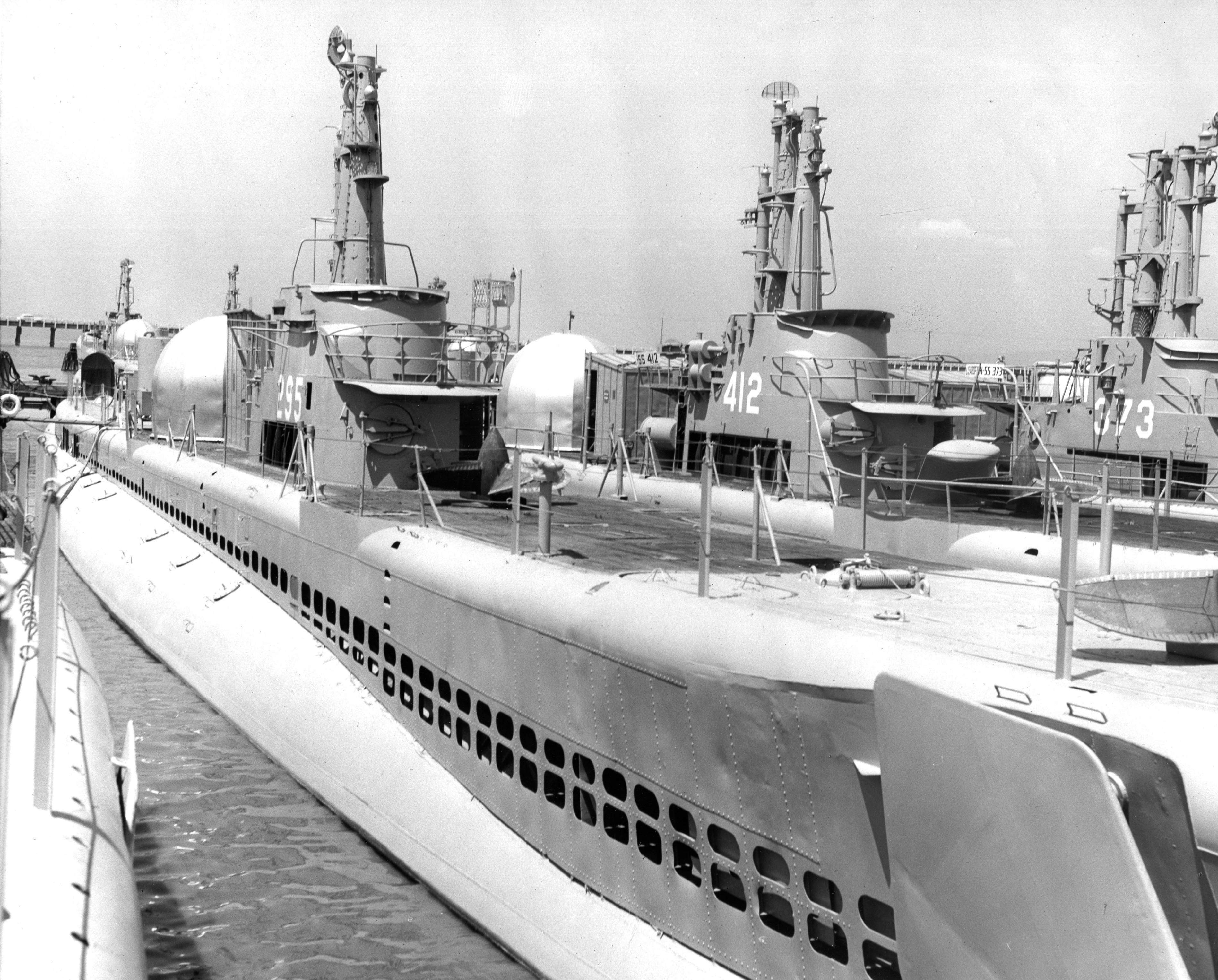 1.12k | Hackleback (SS-295), Trepang (SS-412) and Lizardfish (SS-373) in reserve at Mare Island in May 1953. | Photo courtesy of the files of the Vallejo Naval and Historical Museum, courtesy of Darryl L. Baker. | |