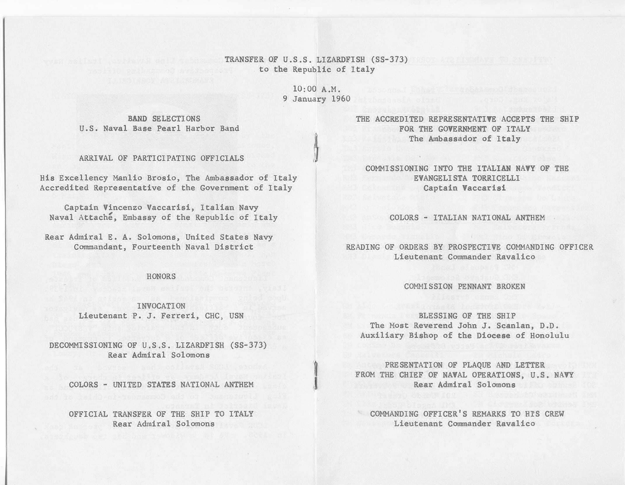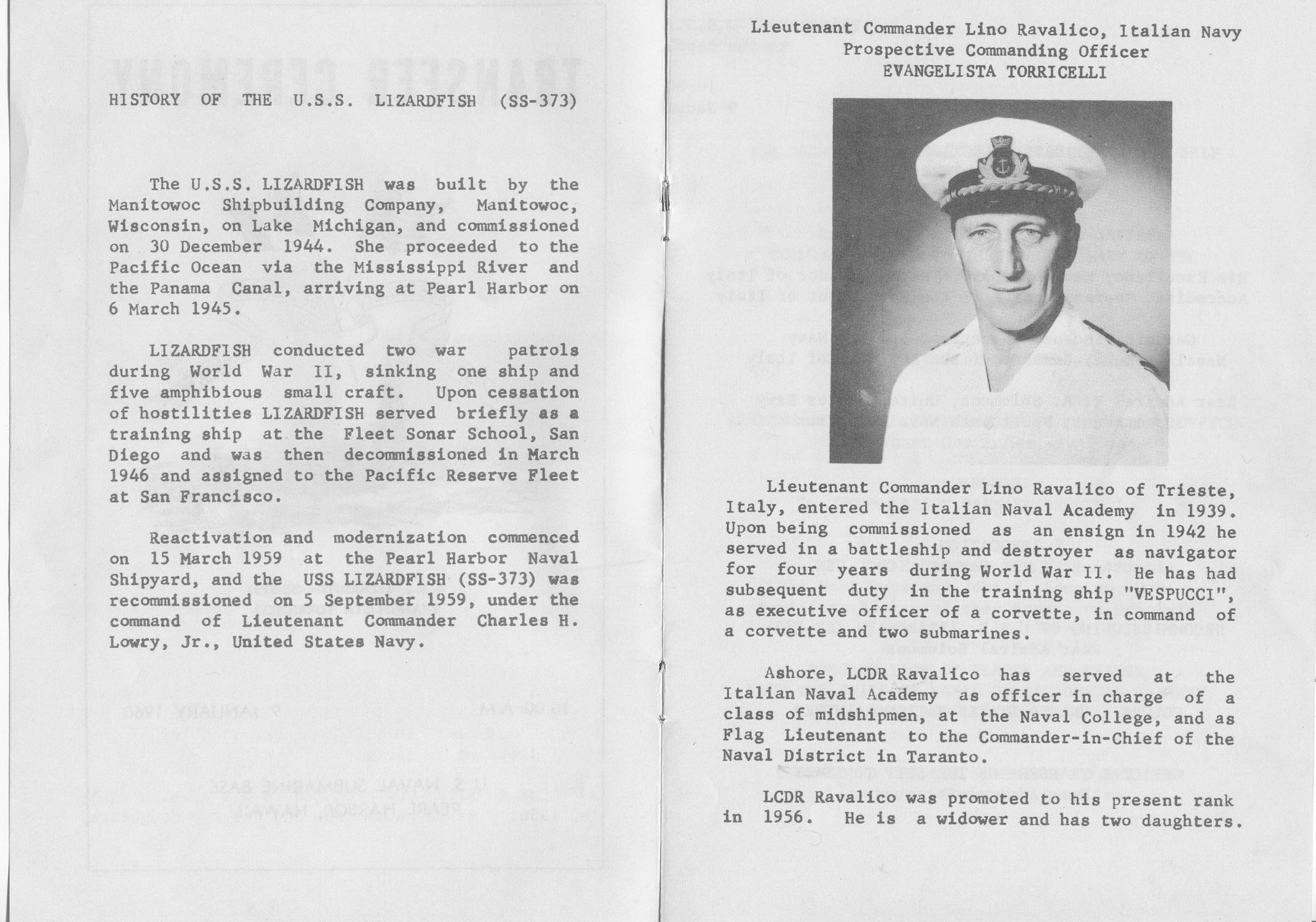 356k | Page 4 & 5 of the Transfer ceremony for the Evangelista Torricelli (S-512), ex-Lizardfish (SS-373) at Pearl Harbor, 9 January 1960. Details, etc. | Photo courtesy of Ron Reeves (of blessed memory). | |