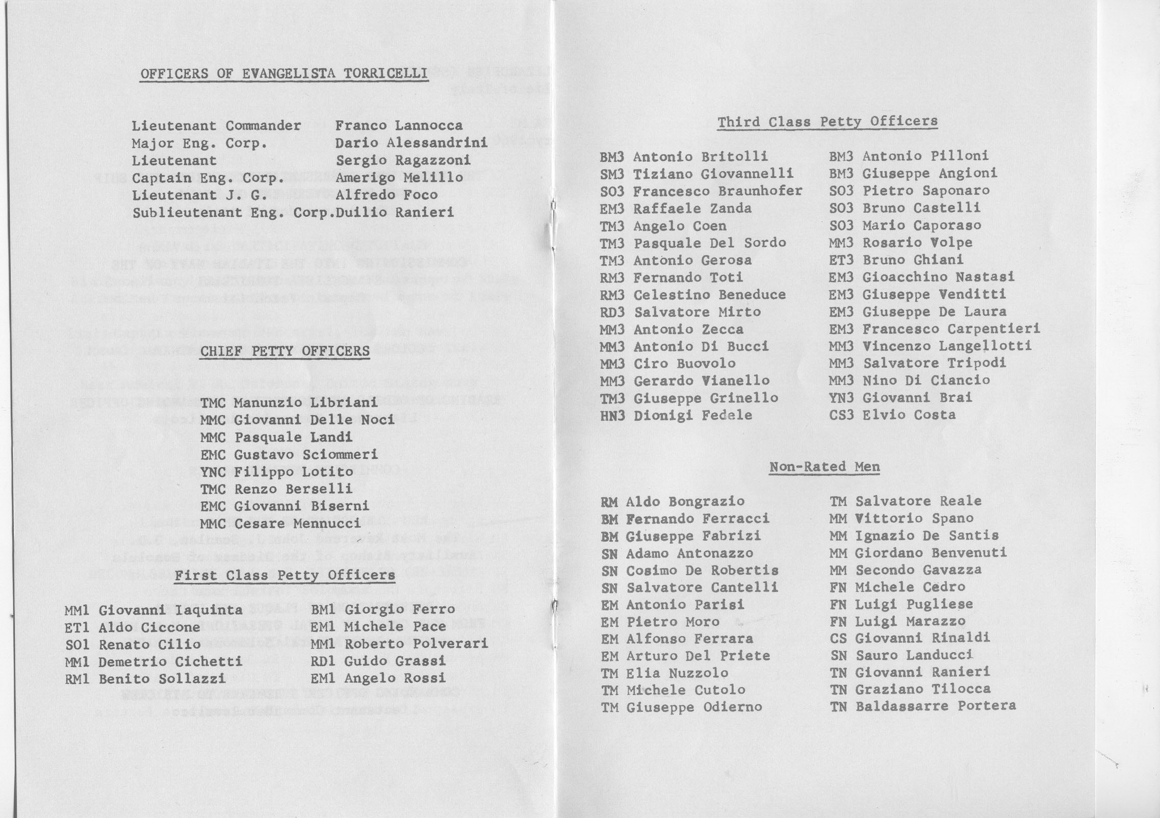 470k | Page 6 & 7 of the Transfer ceremony for the Evangelista Torricelli (S-512), ex-Lizardfish (SS-373) at Pearl Harbor, 9 January 1960. New crewmembers names. | Photo courtesy of Ron Reeves (of blessed memory). | |