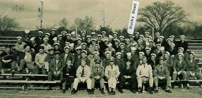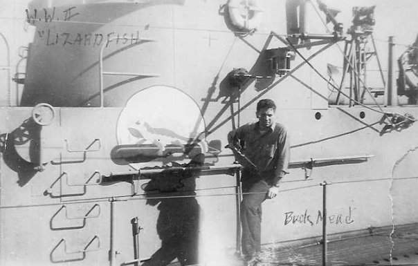 74k | Lizardfish (SS-373) crewmember Walter H. Mead poses next to the emblem of the boat's namesake. | Photo courtesy Lizardfish (SS-373) plankowner Walter H. Mead via his son, Scott Mead. | |