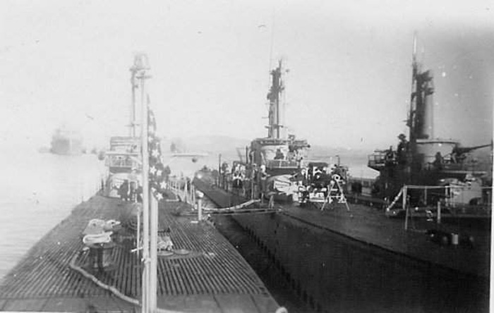 85k | L X 3: Lizardfish (SS-373), Loggerhead (SS-374) & Lamprey (SS-372) The Lizardfish arrived Subic Bay, Philippines, 6 August and was there when Japan capitulated 9 days later. | Text courtesy of DANFS. Photo courtesy Lizardfish (SS-373) plankowner Walter H. Mead via his son, Scott Mead. |